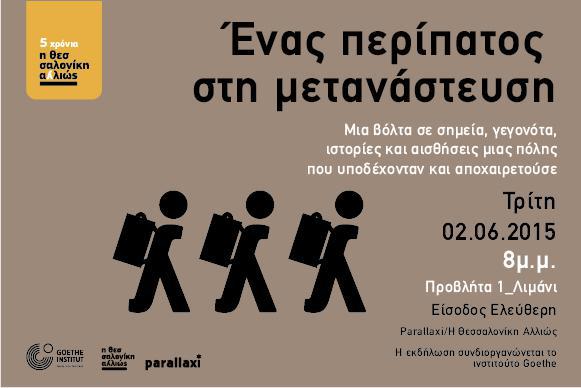 Η Θεσσαλονίκη είναι μια πόλη ταυτισμένη και συνδεδεμένη με τη μετανάστευση. Στο πλαίσιο του Συνάντηση Ευρωπαίων συγγραφέων «Θεσσαλονίκη – Ξαναβρίσκοντας την πολυπολιτισμικότητα: Μεσόγειος, σύνορο και γέφυρα, σε εποχή κρίσης» Συγγραφείς από την Ελλάδα, τις γειτονικές της χώρες της Μεσογείου και τη Γερμανία συζητούν για τη μετανάστευση εν μέσω της ευρωπαϊκής κρίσης, η parallaxi με τη δράση της ‘’Η Θεσσαλονίκη Αλλιώς’’ δημιούργησε ένα διαφορετικό περίπατο που θα αφηγηθεί σε διάρκεια μιάμισης ώρας τις αναχωρήσεις και τις αφίξεις στην πόλη, προσφύγων και μεταναστών από το 1400 μέχρι σήμερα. Με τη βοήθεια δημοσιογράφων, ηθοποιών και μουσικών, καθώς και εικόνας και άλλου οπτικού υλικού, θα περπατήσουμε μαζί από το Λιμάνι μέχρι την πλατεία Δικαστηρίων, με στάσεις σε σημεία της πόλης που διασώζονται και θα αφηγηθούμε ένα ατέλειωτο ταξίδι στα βήματα των μεταναστών.
