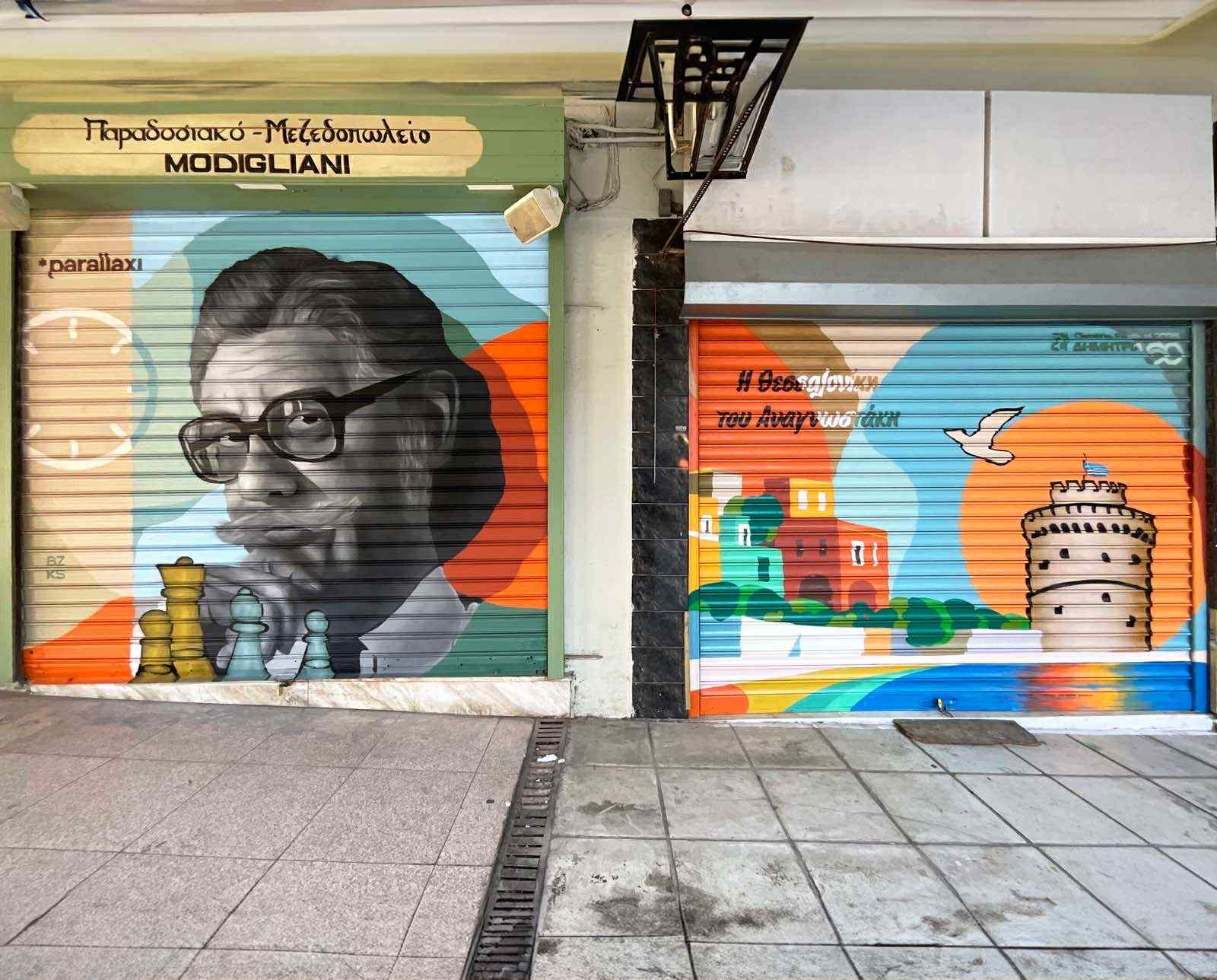 Η φιγούρα του θα δεσπόζει στα ρολά καταστημάτων στο Καπάνι, στο μεζεδοπωλείο Μοντιλιάνι, αλλά και στο διπλανό κατάστημα με είδη προικός. Ο καλλιτέχνης, Γιάννης Μπουζούκης (BZKS) δημιούργησε τρία νέα murals, τα οποία θα κοσμούν τα μαγαζιά και θα θυμίσουν στους θαμώνες, αλλά και στους περαστικούς τη σπουδαία καλλιτεχνική οντότητα μιας μεγάλης προσωπικότητας της Θεσσαλονίκης.