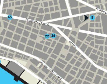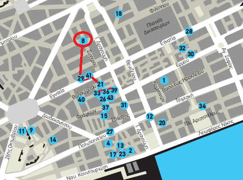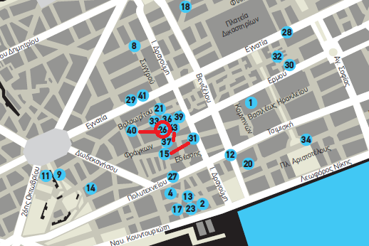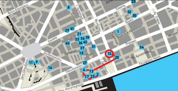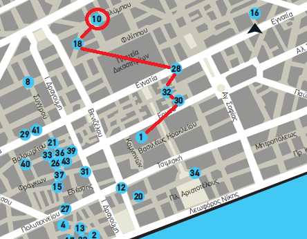1. Πλατεία Δικαστηρίων 10- 18 – 28 – 32 – 30 – 1 (Σημείο έναρξης ξενάγησης στις 18.00 την Τετάρτη 2 Απριλίου το σημείο 10 ”Καφενείο LUX, Ολύμπου 83”)