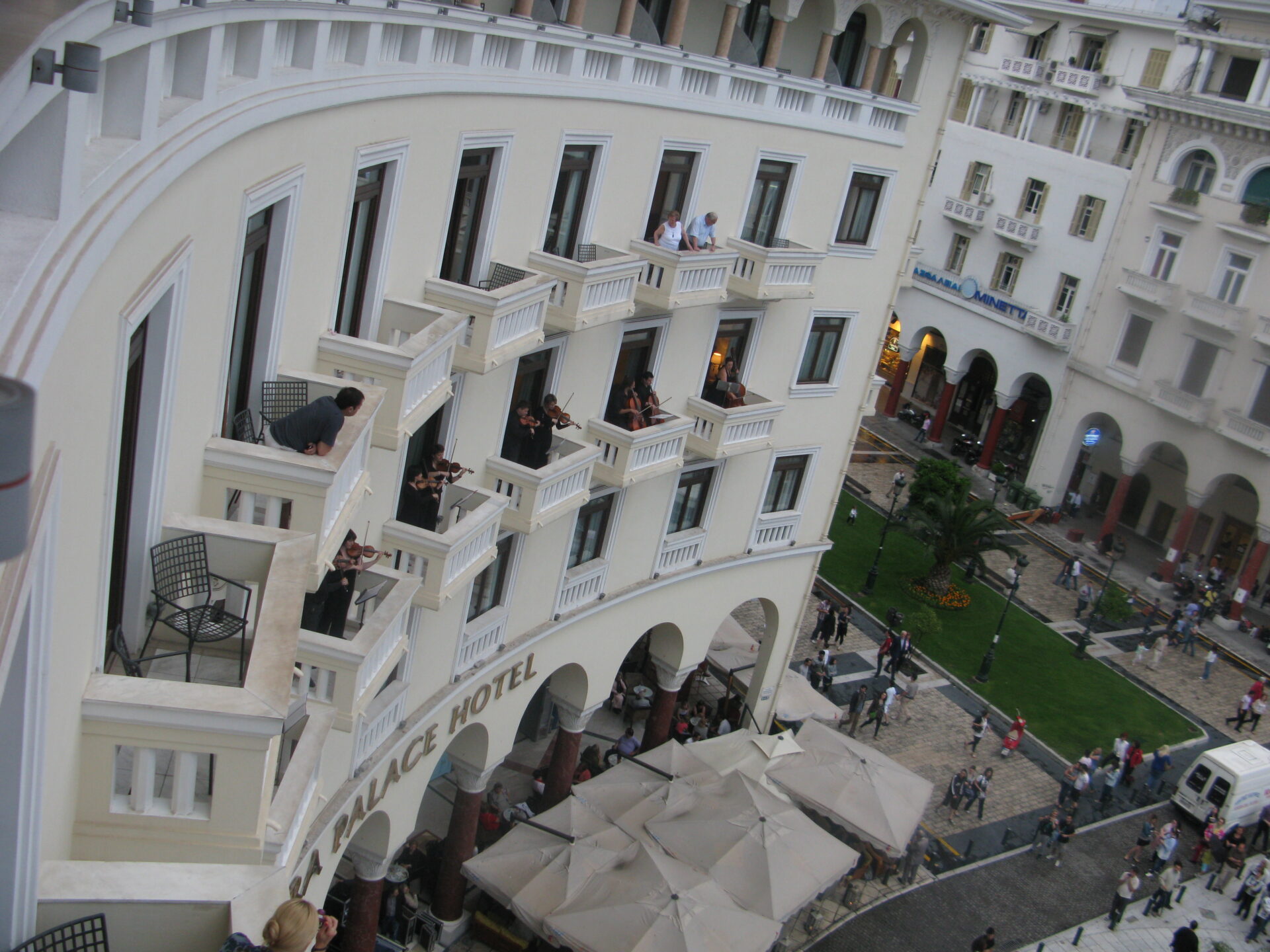 o ποιητικό δρώμενο από το Σαιξπηρικόν με χάρτινα αεροπλανάκια από τα μπαλκόνια του ξενοδοχείου Palace στην οδό Τσιμισκή