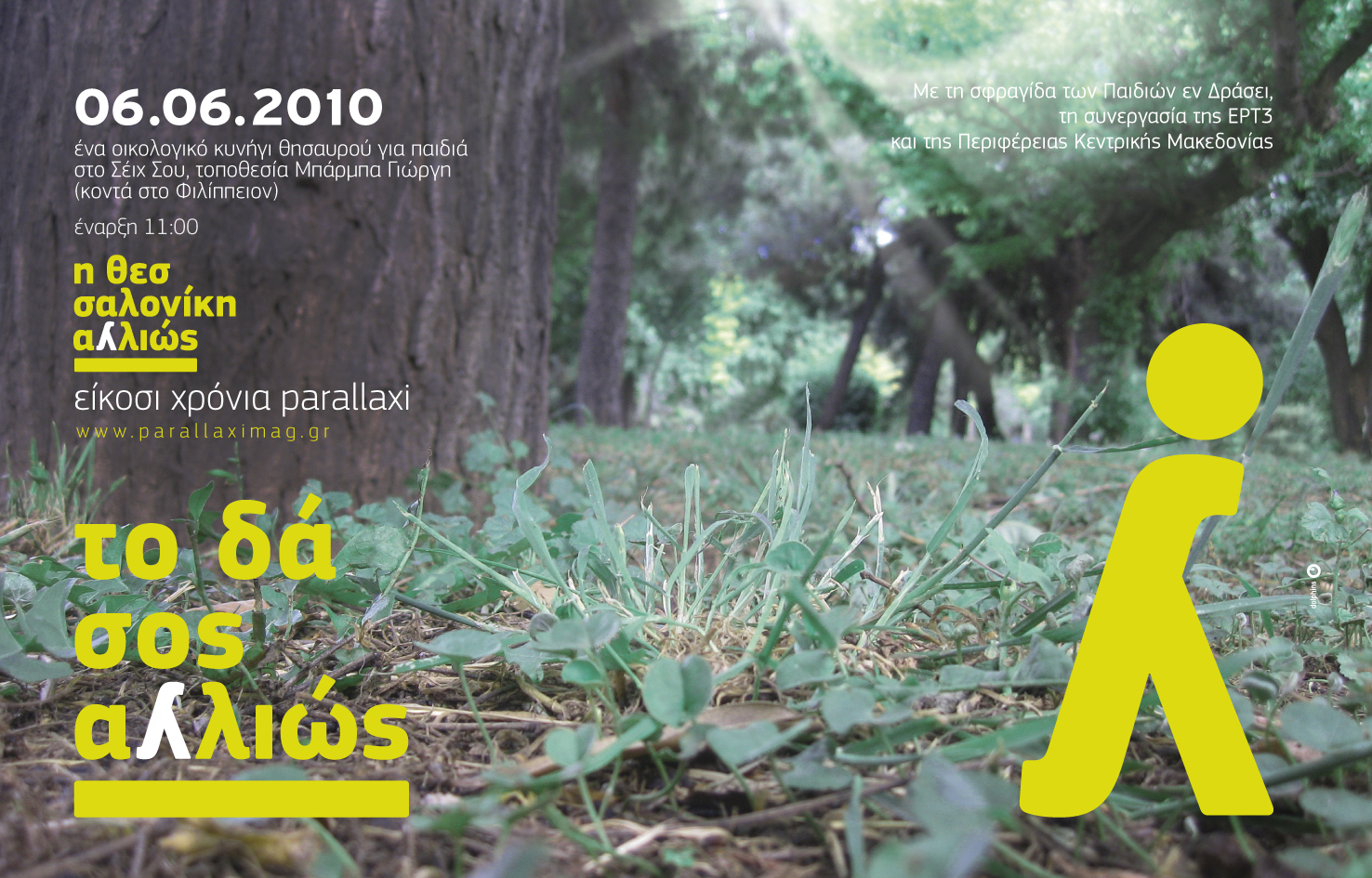 παιχνίδι @ δάσος Ένα πρωτότυπο Κυνήγι Θησαυρού με οικολογικό περιεχόμενο στην καρδιά του Σειχ Σου, στην περιοχή Μπάρμπα Γιώργη, κοντά στο Φιλίππειον. Σε συνεργασία με την ΕΡΤ3 και την Περιφέρεια Κεντρικής Μακεδονίας, και με την φροντίδα της ΜΚΟ οργάνωσης Παιδιά Εν Δράσει που ανέλαβε να μυήσει τα παιδιά στο περι-αστικό δάσος της πόλης.