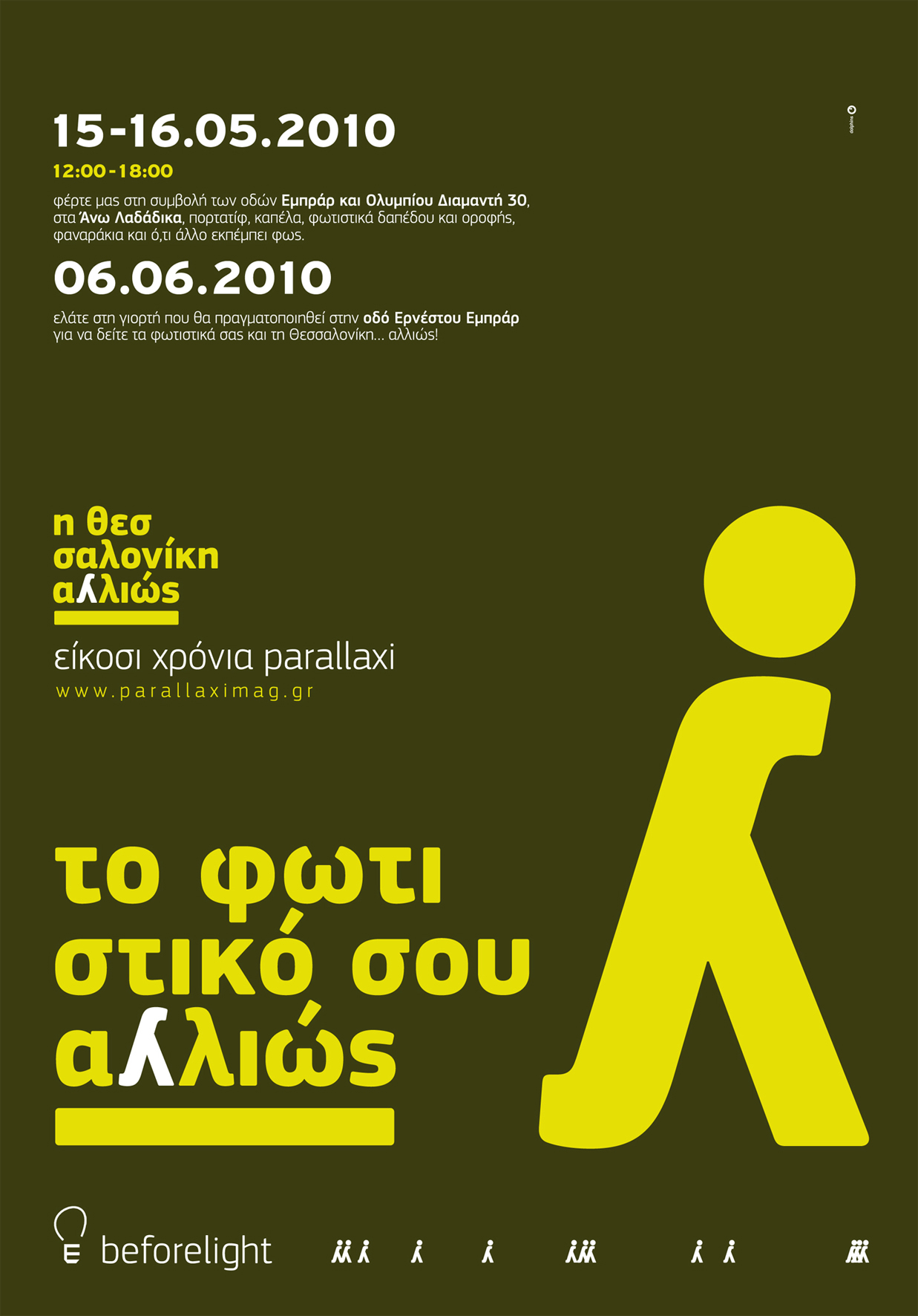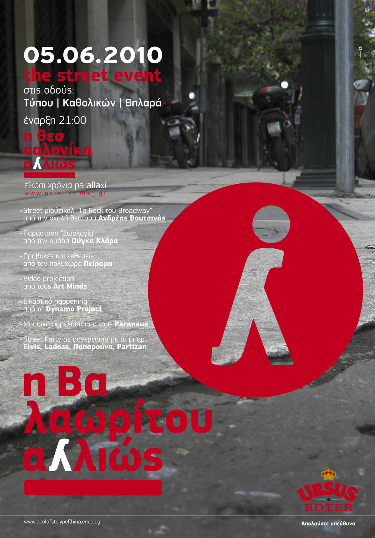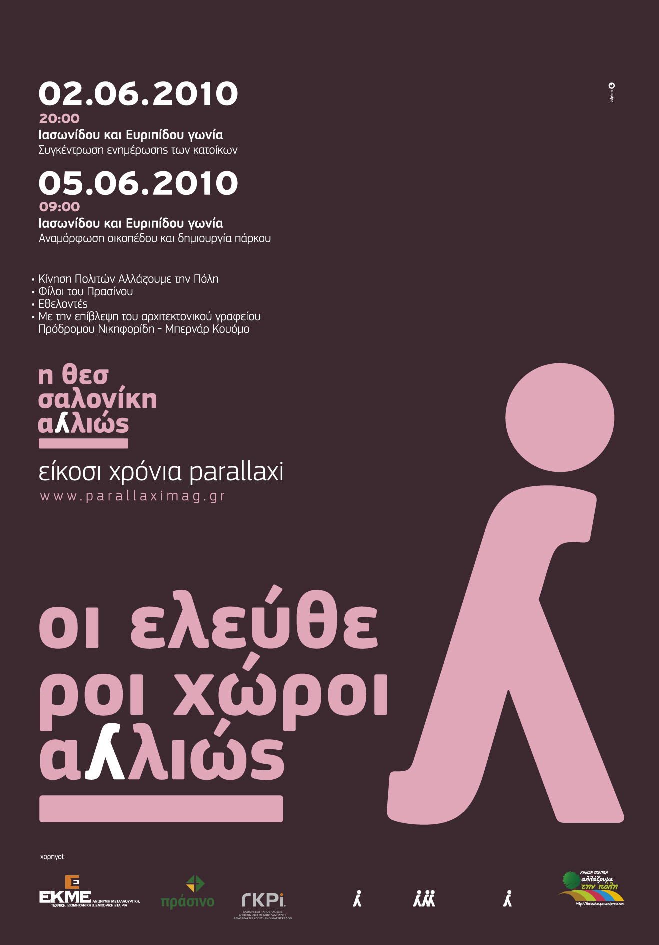 Σε μια περίοδο προβληματισμού και συζήτησης σχετικά με την πόλη της Θεσσαλονίκης, την πόλη του παρελθόντος, την πόλη του παρόντος, την πόλη που ζούμε, την πόλη που αλλάζει και -πάνω από όλα- την πόλη που ονειρευόμαστε, την πόλη αλλιώς, η Parallaxi επιλέγει να γιορτάσει τα είκοσι χρόνια από τότε που εκδόθηκε, οργανώνοντας ένα διήμερο αστικής παρέμβασης και προτάσεων, για το πως θα μπορούσε να είναι η Θεσσαλονίκη του μέλλοντος.