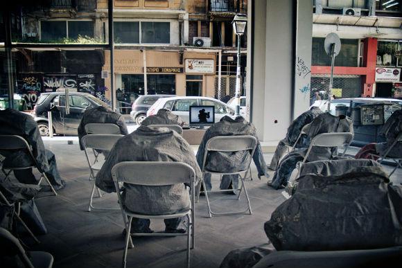 Χθες βράδυ στη Βαλαωρίτου οι περαστικοί έμειναν άφωνοι μπροστά στην ιδέα ενός κενού χώρου που γέμισε ανθρώπους που υποκρίθηκαν τους θεατές ενώ παρακολουθούν την προβολή μιας σκηνής αγάπης στο απέναντι νεοκλασικό. Ένα σκηνικό μαγείας, μια performance από αυτές που ζηλεύουμε συχνά σε πόλεις του εξωτερικού σε μια από τις παλιές αστικές γειτονιές της πόλης. Σαράντα λεπτά ονείρου που έπαιζαν με την ιδέα του κενού χρόνου και μάγεψαν κοινό και περαστικούς. Η βιτρίνα θα μείνει με την εγκατάσταση για δέκα ακόμα μέρες, συνεπώς προγραμματίστε μια επίσκεψη εκεί.