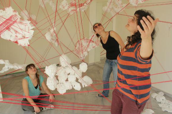 Η συγκεκριμένη ρήση του Αριστοτέλη, ”Φόβος Κενού” σύμφωνα με την οποία “η φύση απεχθάνεται τα κενά και βρίσκει τρόπο να τα συμπληρώνει” με οδηγεί σε μία διαδικασία να μεταφέρω αυτό, το σχεδόν πάντα επίκαιρο ρητό, στη δική μας εποχή και πόλη η οποία με την υπάρχουσα κρίση έχει αρχίσει να αλλάζει πρόσωπο και αυτό είναι ένα γεγονός πολύ λυπηρό. Όπως επηρεάζει το αστικό τοπίο, με τον ίδιο τρόπο επηρεάζει και το κοινωνικό σύνολο και συγκεκριμένα και την ανθρώπινη ψυχοσύνθεση, εδώ ουσιαστικά ξεκινά και η δική μου ιδέα. Με την γενικότερα έντονη, γρήγορη και κακή καθημερινή ποιότητα ζωής, με την απουσία διαλείμματος και χαλάρωσης, έτσι ώστε να επέλθει η συνειδητοποίηση της ζωής μας, δημιουργούνται στον άνθρωπο αισθήματα χρόνιου κενού. Τα οποία καλούμαστε, όπως σοφά ενεργεί η φύση, να συμπληρώσουμε. Έτσι πρέπει σαν μονάδες για αρχή να γεφυρώσουμε τα προσωπικά μας κενά και σαν σύνολα στην πορεία να βρούμε τρόπους να δίνουμε ζωή και δημιουργία σε αυτά, καλύπτοντάς τα με σύνεση, εξωστρέφεια και θάρρος. Η εγκατάσταση αποτελείται ουσιαστικά από δύο υλικά. Το ένα είναι η λευκή γυψόγαζα και το άλλο η κόκκινη κλωστή. Οι κλωστές, στοιχεία ζωτικότητας, νευρώνες, είναι ραμμένες σε πολλαπλά επίπεδα, δηλαδή και πάνω στην γυψόγαζα και ανάμεσα, ενώνοντας το υλικό και γύρω από την εγκατάσταση με τις κλωστές να δημιουργούν τις δικές τους γωνίες γύρω απ;o όλη την εγκατάσταση.