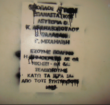 «Στις 20/2 πραγματοποίηθηκε παρέμβαση στο γραφείο του βουλευτή της ΝΔ Δ. Κούβελα με σπρέι και τρικάκια, ως ένδειξη αλληλεγγύης στους συντρόφους Γ. Μιχαηλίδη, Δ. Βαλαβάνη και Κ. Αθανασοπούλου. Στο stencil αναγραφόταν: ΕΝΟΠΛΟΣ ΑΓΩΝΑΣ ΕΠΑΝΑΣΤΑΤΙΚΟΣ ΛΕΥΤΕΡΙΑ ΣΕ Κ. ΑΘΑΝΑΣΟΠΟΥΛΟΥ, Δ. ΒΑΛΑΒΑΝΗ, Γ. ΜΙΧΑΗΛΙΔΗ ΕΧΟΥΜΕ ΠΟΛΕΜΟ Η ΔΗΜΟΚΡΑΤΙΑ ΔΕ ΘΑ ΝΙΚΗΣΕΙ-ΘΑ ΣΑΣ ΤΕΛΕΙΩΣΟΥΜΕ ΚΑΤΩ ΤΑ ΞΕΡΑ ΣΑΣ ΑΠΟ ΤΟΥΣ ΣΥΝΤΡΟΦΟΥΣ ΜΑΣ