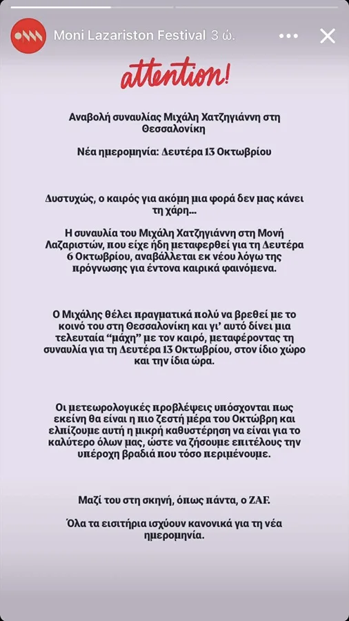 «Ο καιρός για ακόμη μία φορά δεν μας κάνει τη χάρη… Η συναυλία του Μιχάλη Χατζηγιάννη στη Μονή Λαζαριστών, που είχε ήδη μεταφερθεί για τη Δευτέρα 6 Οκτωβρίου, αναβάλλεται εκ νέου λόγω της πρόγνωσης για έντονα καιρικά φαινόμενα.