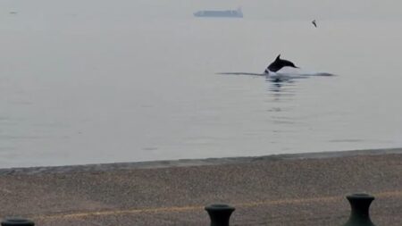 Μπροστά σε ένα απρόσμενο θέαμα βρέθηκαν το πρωί της Δευτέρας (17/11) οι διερχόμενοι στην παραλία της Θεσσαλονίκης, όταν δελφίνια έκαναν την εμφάνισή τους στα ήρεμα νερά του Θερμαϊκού.