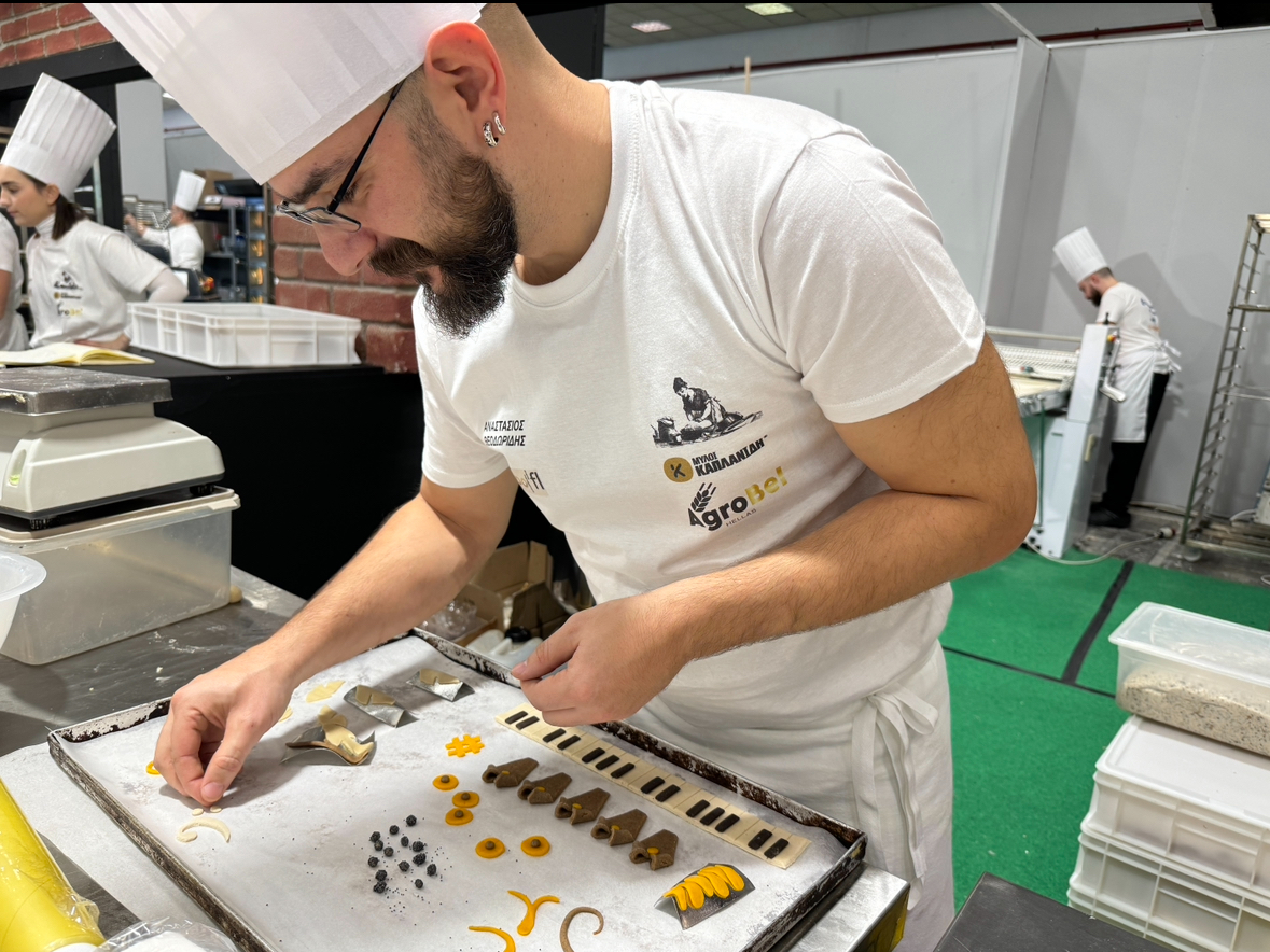 Με περίτεχνες κινήσεις, σμιλεύει το ζυμάρι και δημιουργεί πραγματικά έργα τέχνης. Το αλεύρι ενώνεται με το σιρόπι στα χέρια του και ξεπηδούν νότες, κοντραμπάσο και πιάνο. Ο Τάσος Θεοδωρίδης αρτοποιός από το Νέο Μυλότοπο Πέλλας, είναι ένας από τους συμμετέχοντες στο φετινό 6ο Πανελλήνιο Πρωτάθλημα Ψωμιού που διεξάγεται στο πλαίσιο της 11ης Artozyma και που πραγματοποιείται στις εγκαταστάσεις της ΔΕΘ-Helexpo.