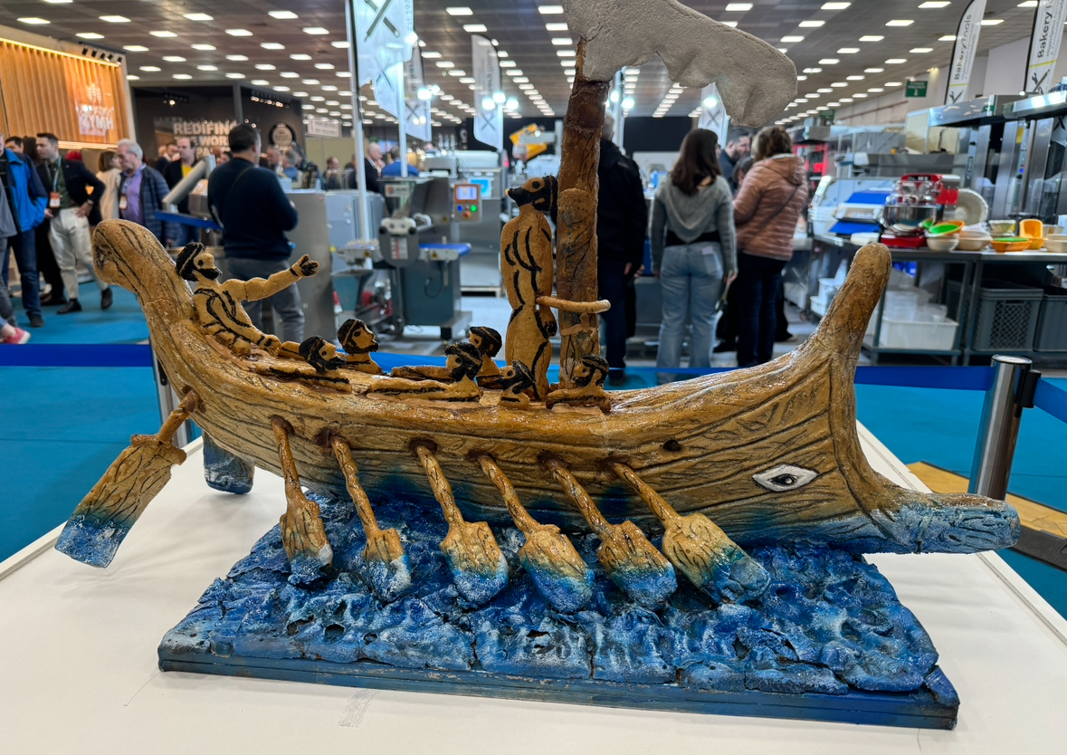 Δίπλα του ακριβώς, βρίσκεται ένα εντυπωσιακό αρχαιοελληνικό καράβι που με δυσκολία κάποιος αντιλαμβάνεται πως είναι παρασκευασμένο με ζυμάρι. «Εδώ στο χώρο φιλοξενούμε και το καράβι του Οδυσσέα, όπου είναι δεμένος στο κατάρτι για τις Σειρήνες. Αυτό το είχα φτιάξει πριν από τέσσερα χρόνια στο Πανελλήνιο Πρωτάθλημα και αυτό μου έδωσε την πρόκριση στην εθνική ομάδα και καταφέραμε και φτάσαμε στο μεγαλύτερο διαγωνισμό που είναι το Παγκόσμιο Πρωτάθλημα αρτοποιίας που γίνεται κάθε δύο χρόνια στο Παρίσι. Πριν από ένα μήνα, πήραμε την έβδομη θέση παγκοσμίως και τώρα βρισκόμαστε εδώ στο 6ο Πρωτάθλημα Αρτοποιίας που γίνεται κάθε δύο χρόνια στη Θεσσαλονίκη και περιμένουμε να βγούνε οι καλύτερες ομάδες, οι οποίες θα αποτελέσουν τη δική μας συνέχεια» υπογραμμίζει.