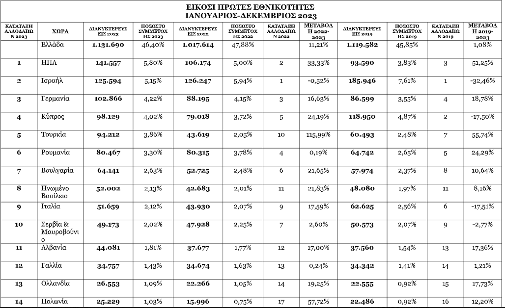 Την περσινή χρονιά οι υπόλοιπες εθνικότητες παρουσίασαν στην πλειοψηφία τους αύξηση σε σχέση με το 2022. Σε απόλυτους αριθμούς, το 2023 καταγράφηκαν 1.307.152 διανυκτερεύσεις αλλοδαπών επισκεπτών, αριθμός αυξημένος κατά 17,99 % από το 2022, κατά το οποίο καταγράφηκαν 1.107.819 διανυκτερεύσεις αλλοδαπών.