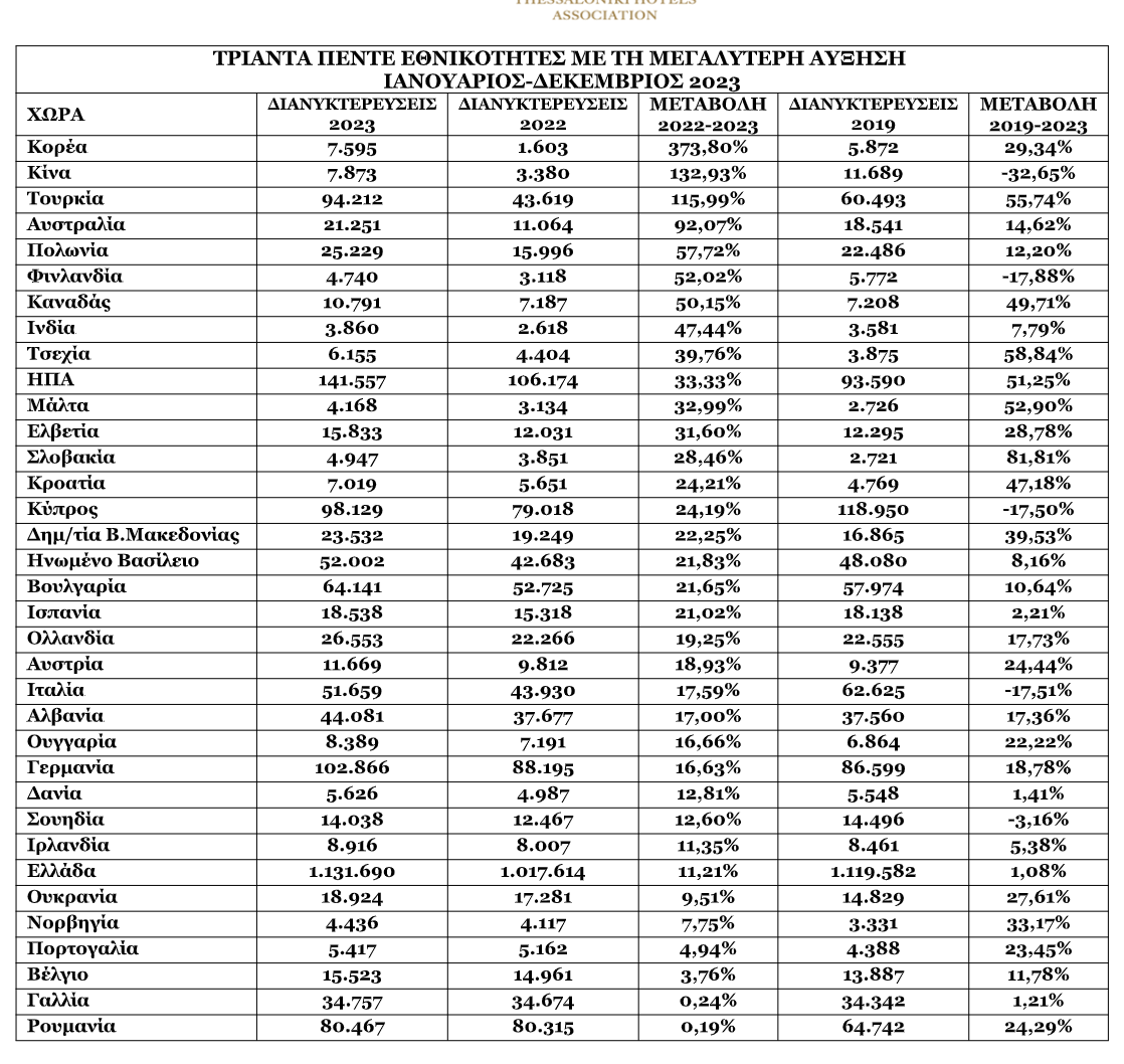 Με άνοδο της τάξης του 14,75% σε σύγκριση με το 2022 και οριακή μείωση της τάξης του -0,13% σε σύγκριση με το 2019 έκλεισε για την περιοχή της Θεσσαλονίκης η χρονιά του 2023. Σύμφωνα με τα στατιστικά στοιχεία της Ένωσης Ξενοδόχων Θεσσαλονίκης, την περσινή χρονιά καταγράφηκαν 2.438.842 διανυκτερεύσεις Ελλήνων και αλλοδαπών επισκεπτών, ενώ τα έτη 2022 & 2019 είχαν καταγραφεί 2.125.433 & 2.442.020 διανυκτερεύσεις αντίστοιχα. Οι Έλληνες συνέχισαν να κατέχουν την πρώτη θέση στην κατάταξη των εθνικοτήτων και για το 2023, σημειώνοντας αύξηση 11,21% σε σχέση με το 2022. Σε απόλυτους αριθμούς οι διανυκτερεύσεις τους ανήλθαν σε 1.131.690 (ποσοστό 46,40%) ενώ το 2022 είχαν ανέλθει σε 1.017.614 (ποσοστό 47,88%).