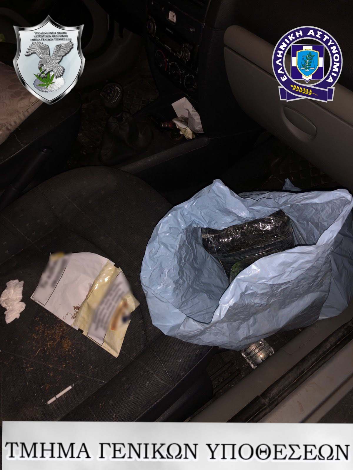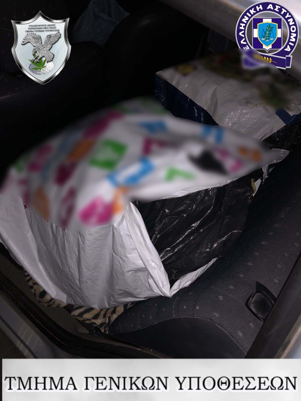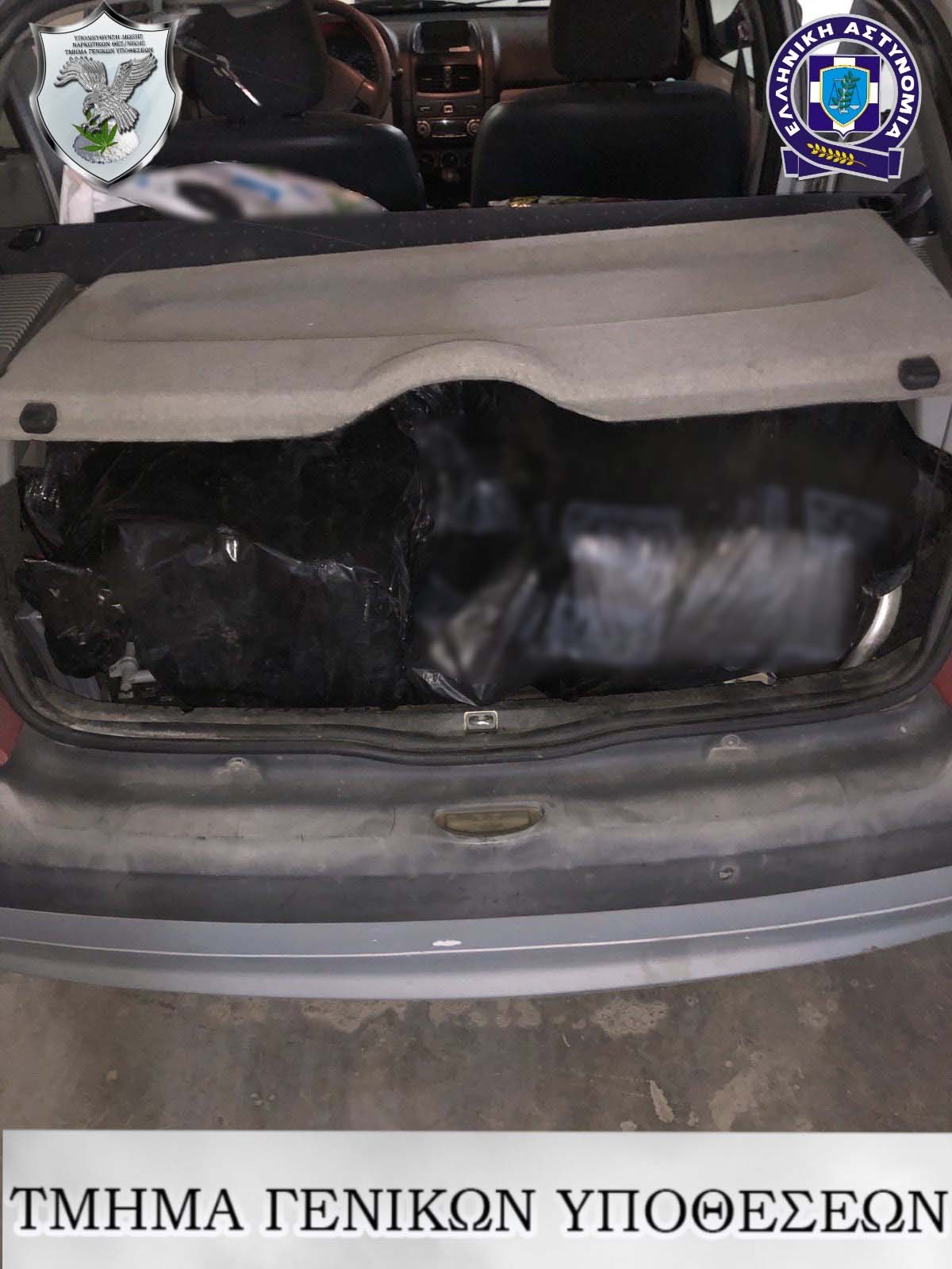 Δέματα ακατέργαστης κάνναβης συνολικού βάρους 43 κιλών και 426,5 γραμμαρίων, τα περισσότερα εκ των οποίων επιμελώς κρυμμένα σε διάφορα σημεία του οχήματος (λεβιές ταχυτήτων, δάπεδο, πορτ μπαγκάζ κ.α.), ποσότητα ακατέργαστης κάνναβης αναμεμειγμένη με καπνό μικτού βάρους (8,8) γραμμαρίων,