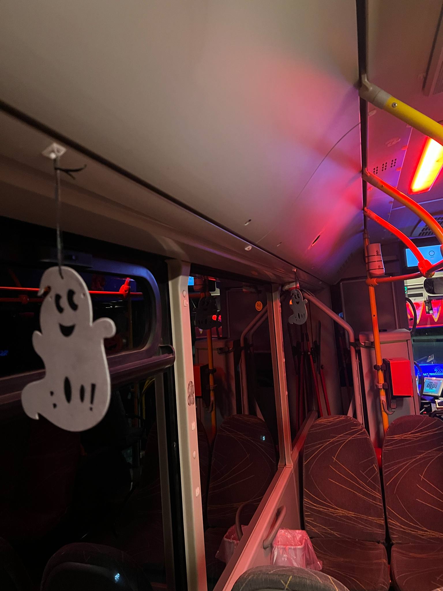 «Πλέον μας έχουν μάθει και περιμένουν από εμάς τον στολισμό», λέει, μιλώντας στο ΑΠΕ-ΜΠΕ, και όπως μπορεί να διαπιστώσει κανείς από τις εικόνες, έδωσε πάλι τον καλύτερό του εαυτό και μετέφερε το Halloween στο εσωτερικό του λεωφορείου.
