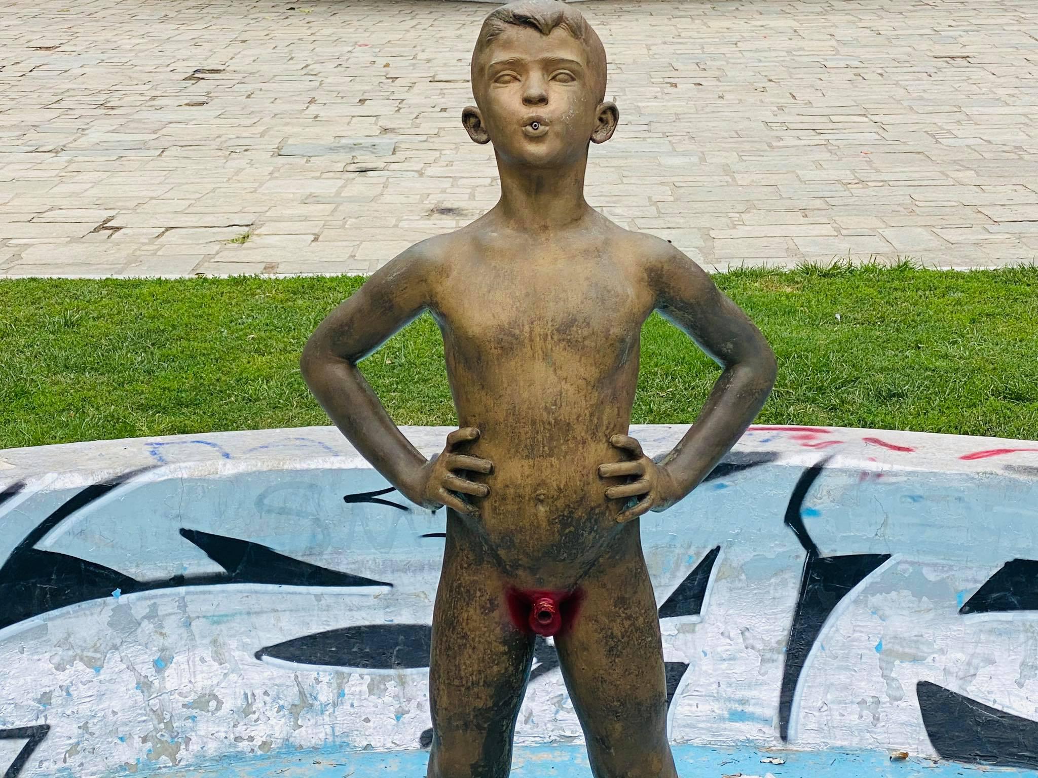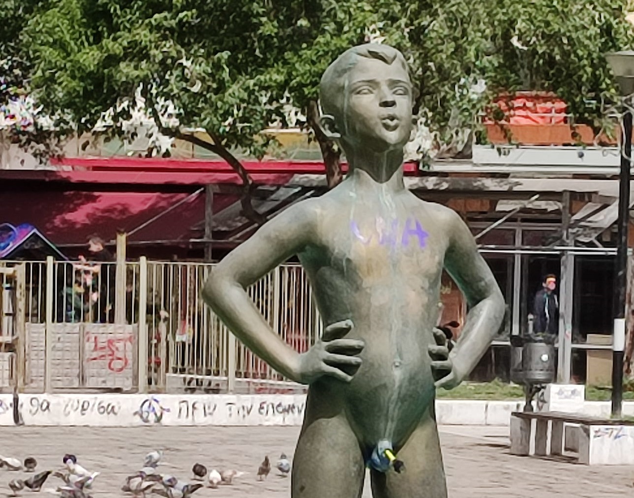 Ένα αγόρι στην προεφηβική ηλικία, ανέμελο και με περίσσιο θράσος ορθώνει το ανάστημα του, σφυρίζει και ταυτόχρονα ουρεί, ανακυκλώνοντας το νερό στο μικρό σιντριβάνι της πλατείας.