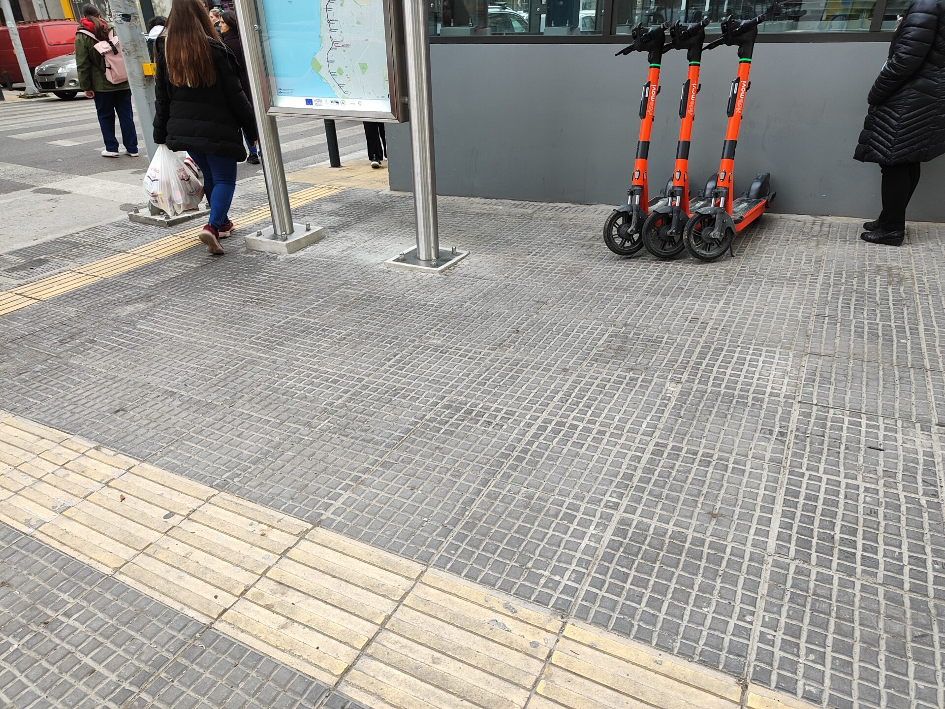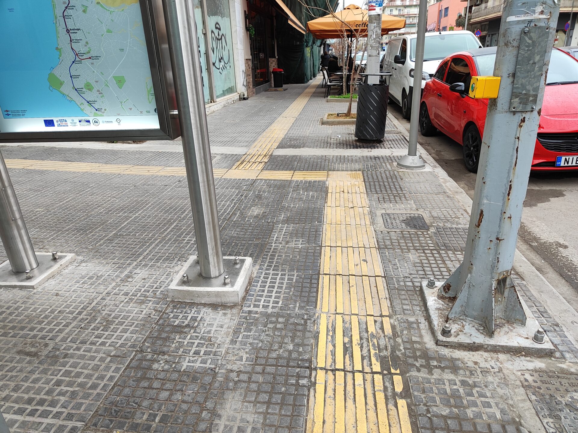 Ιδιαίτερα σε ένα πεζοδρόμιο που υπάρχει ελάχιστος χώρος για να περάσει ένα άτομο με αναπηρικό αμαξίδιο εξαιτίας της πινακίδας του μετρό που υπάρχει εκεί, αλλά και του σηματοδότη.