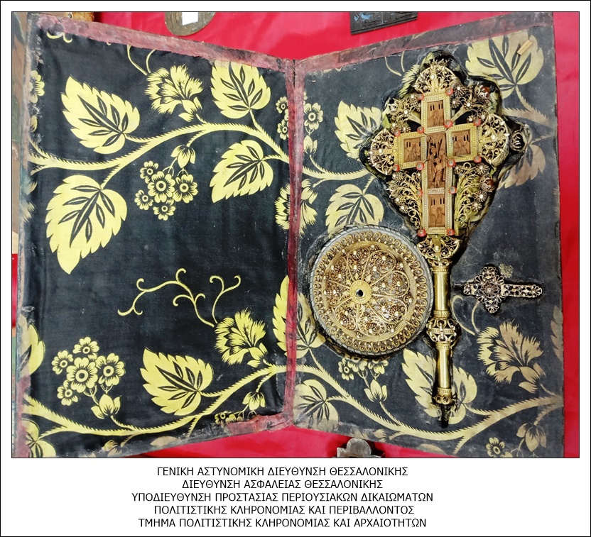 - Ξύλινη δίπτυχη κασετίνα, με εσωτερική υφασμάτινη επένδυση, περιέχουσα τρία αντικείμενα και συγκεκριμένα, μεταλλικό σταυρό ευλογίας με ξύλινο πυρήνα, μεταλλική κυκλική βάση του σταυρού και αυτοτελή μικρό μεταλλικό σταυρό με κρίκο ανάρτησης στο πάνω μέρος του σταυρού, κατασκευασμένα με συρματερή τεχνική και κοκκίδωση με επίθετους ημιπολύτιμους λίθους.