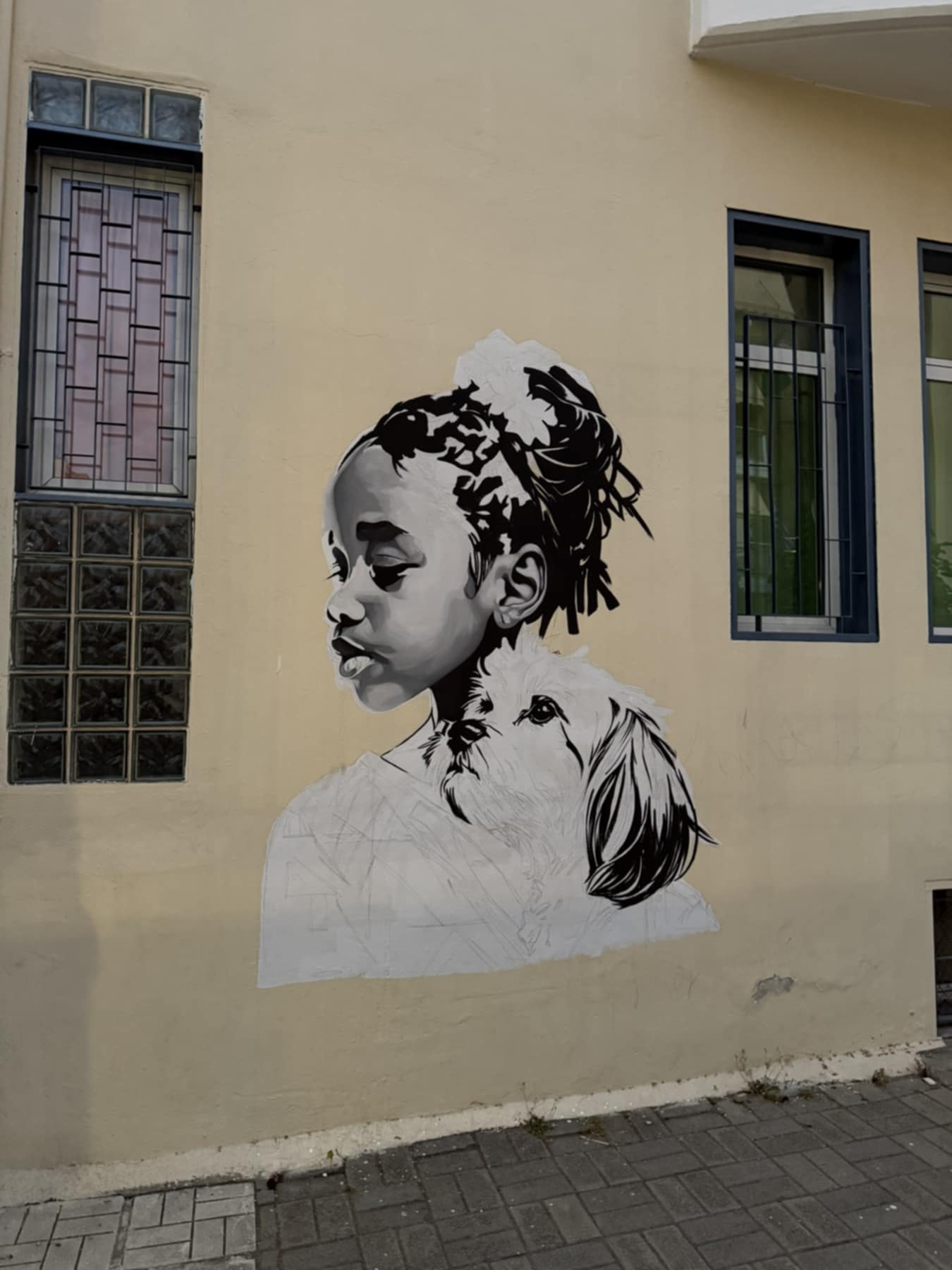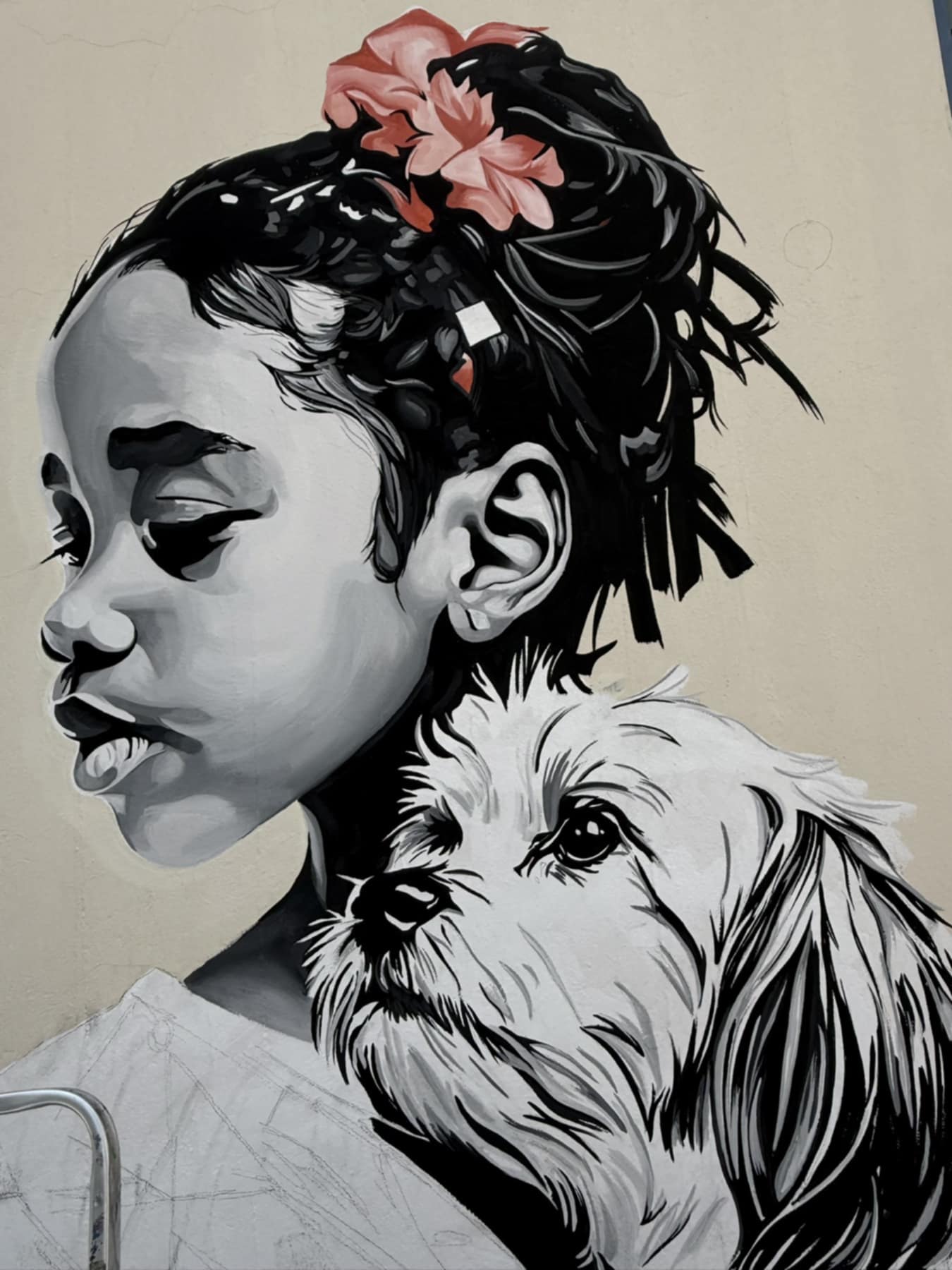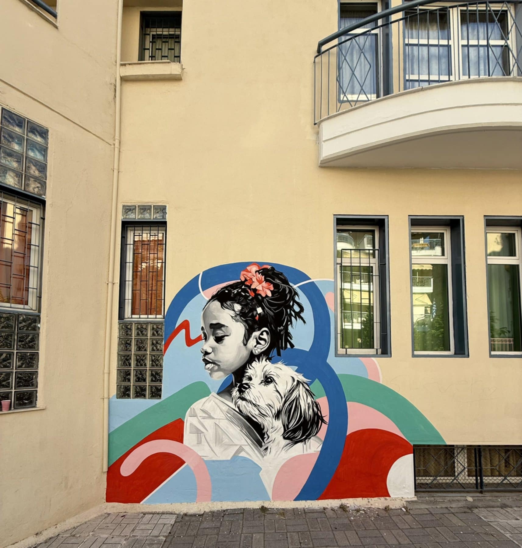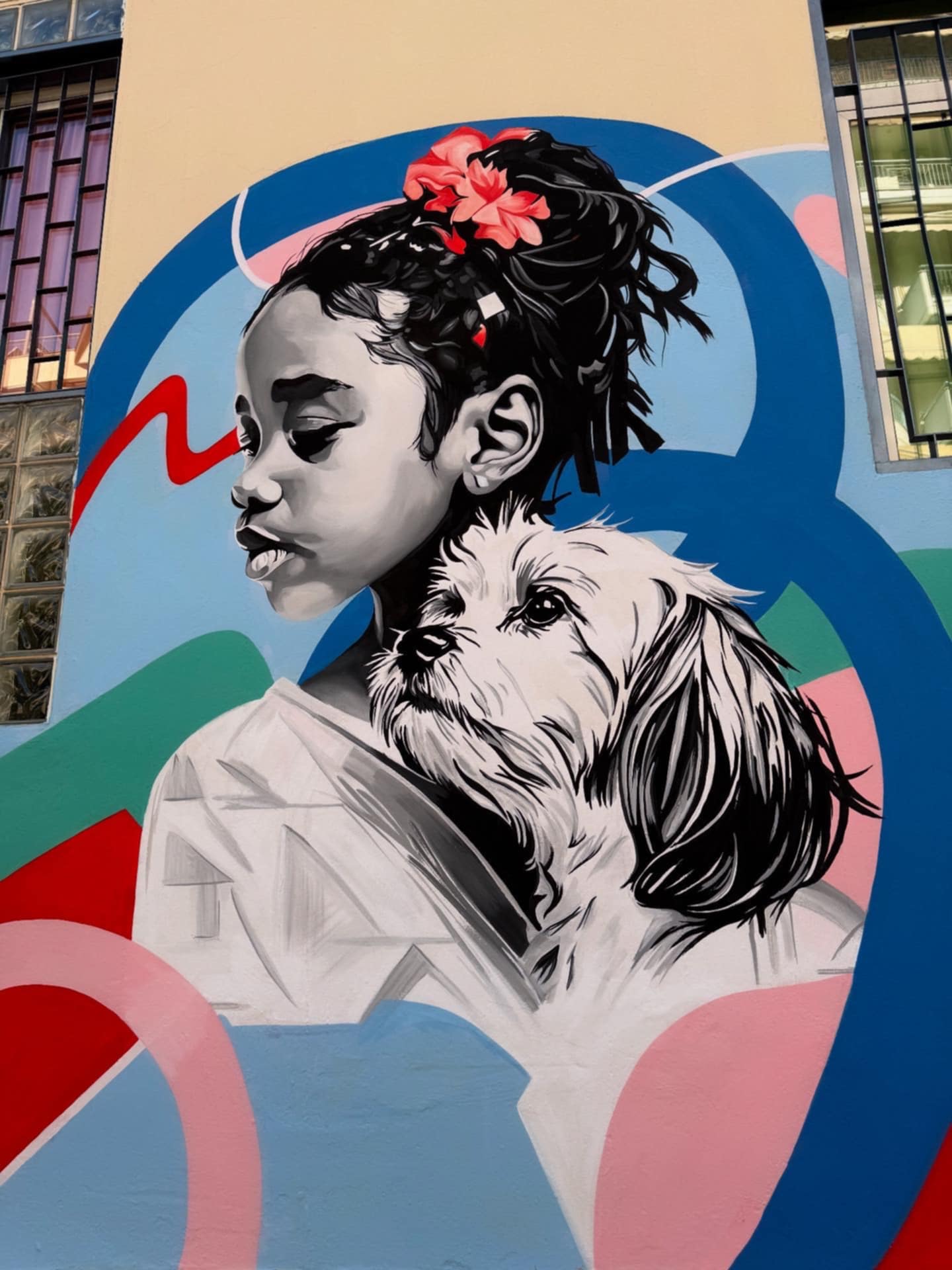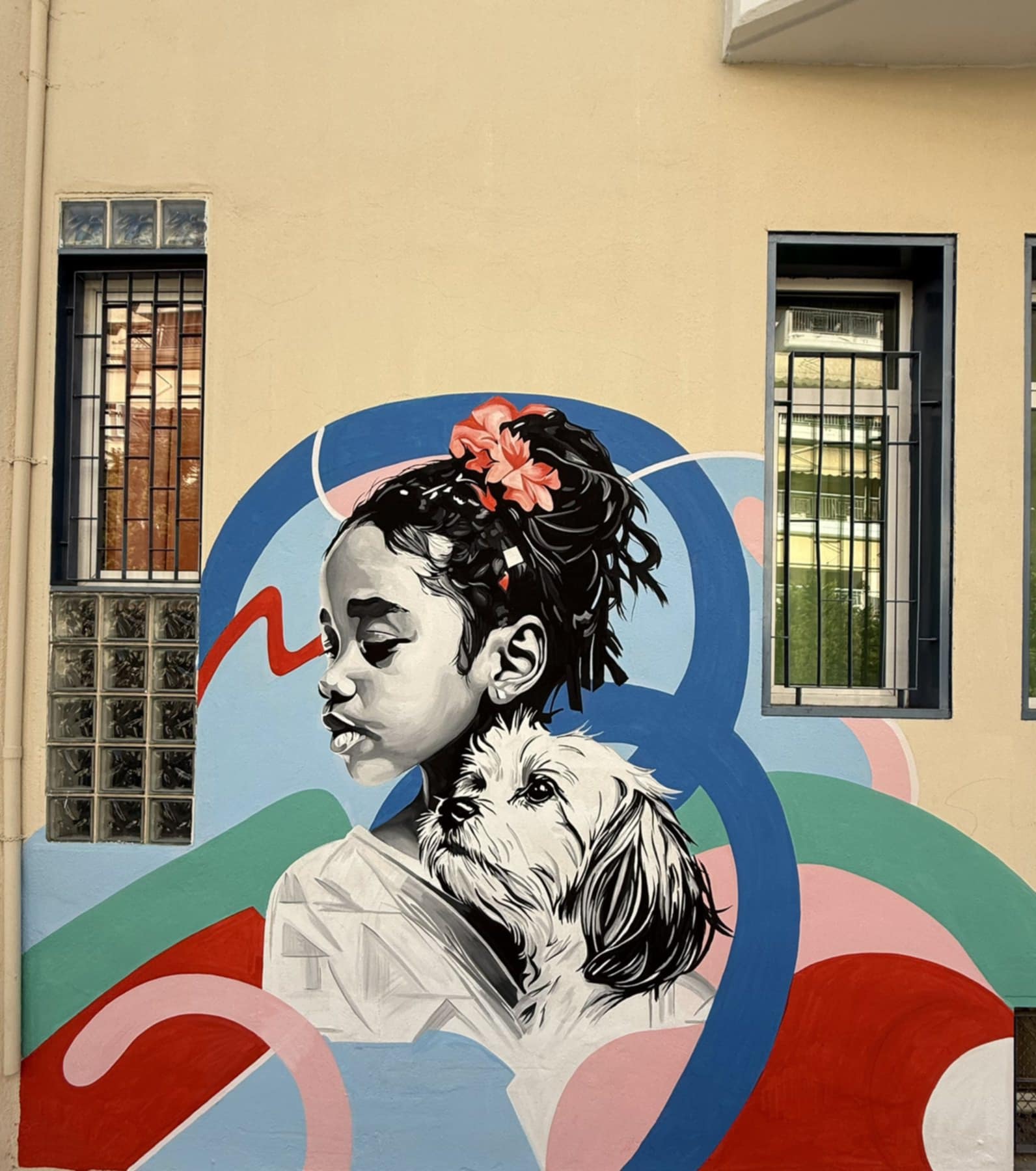 Αυτή τη φορά, πρόκειται για μία τοιχογραφία που απεικονίζει μία κοπέλα αφρικανικής καταγωγής, η οποία κρατάει έναν σκύλο.
