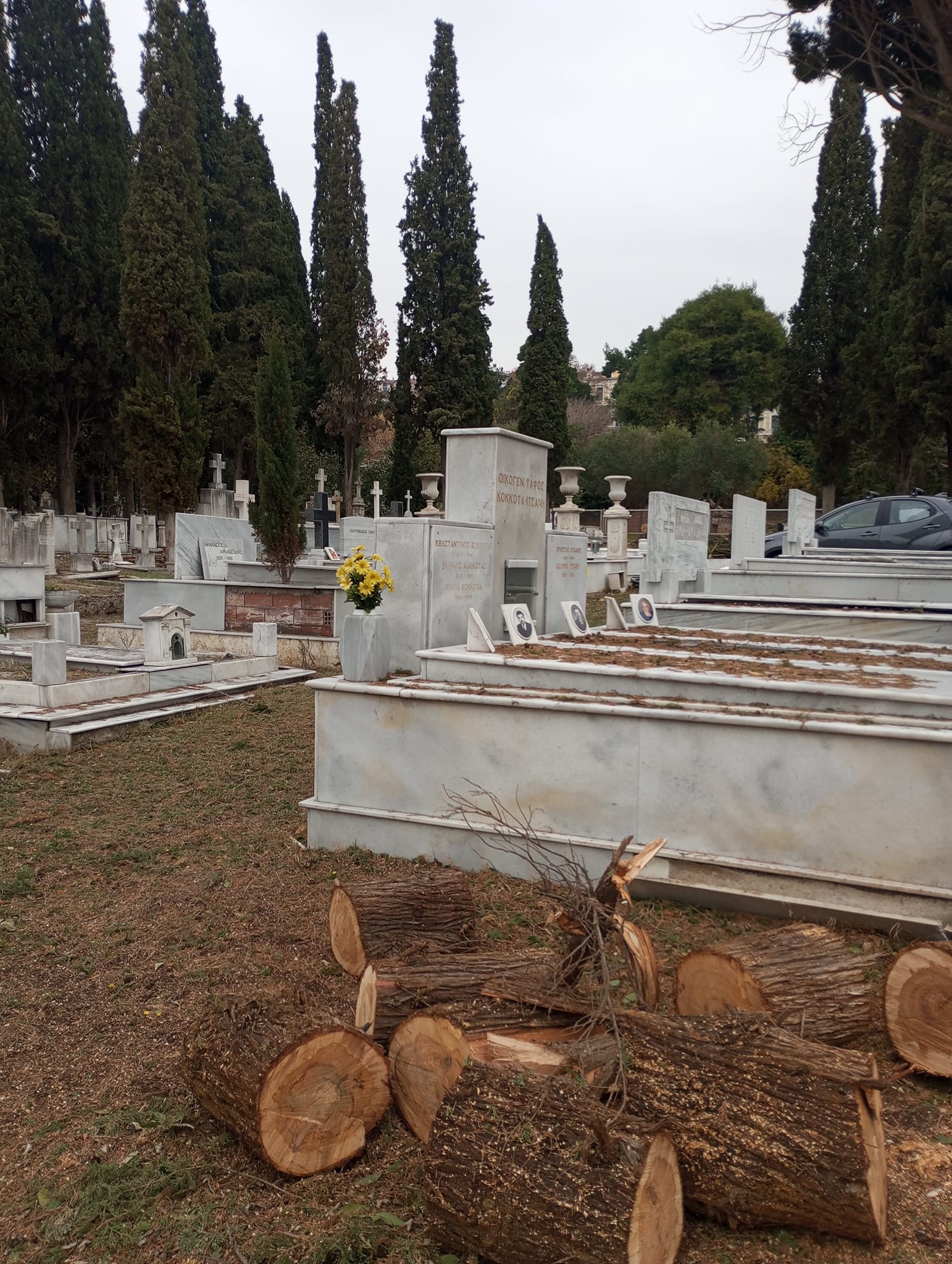 Τα Κοιμητήρια της Ευαγγελίστριας, επλήγησαν και αυτά από την κακοκαιρία, με την πτώση δεκάδων αιωνόβιων Κυπαρισσιών.