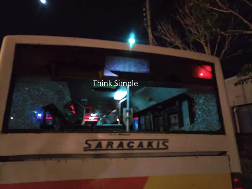 Σύμφωνα με μαρτυρίες επιβατών και του οδηγού, ομάδα νεαρών αλλοδαπών πέταξαν πέτρες στο λεωφορείο το οποίο ήταν γέματο και εν κινήσει με αποτέλεσμα να σπάσει το παρμπρίζ του του λεωφορείου.