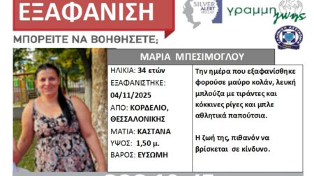 Συγκεκριμένα, όπως αναφέρεται στην ιστοσελίδα της Γραμμής Ζωής η Μαρία Μπεσίμογλου, 34 ετών, εξαφανίστηκε από το σπίτι της, στο Κορδελιό Θεσσαλονίκης, το πρωί της 04/11/25, όταν έφυγε για να πάει στο φούρνο της γειτονιάς της και δεν επέστρεψε.