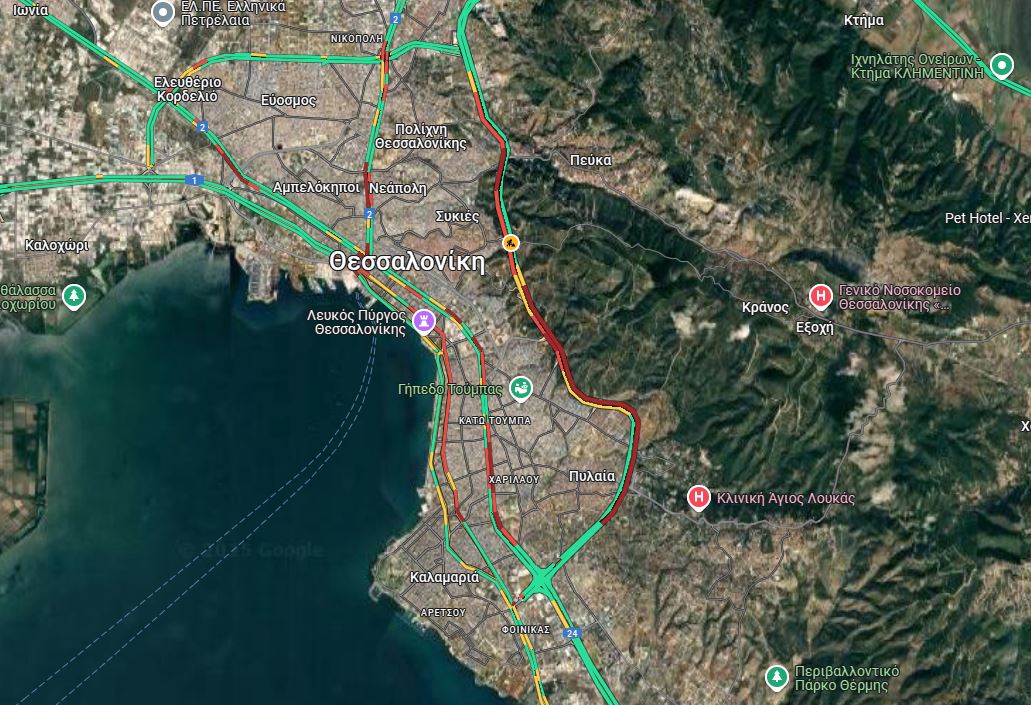 Από την άλλη πλευρά, στην κατεύθυνση προς ανατολικά, μεγάλο μποτιλιάρισμα υπάρχει από το 424 μέχρι και το Επταπύργιο, καθώς και από τις Σαράντα Εκκλησιές μέχρι και τα Κωνσταντινουπολίτικα.