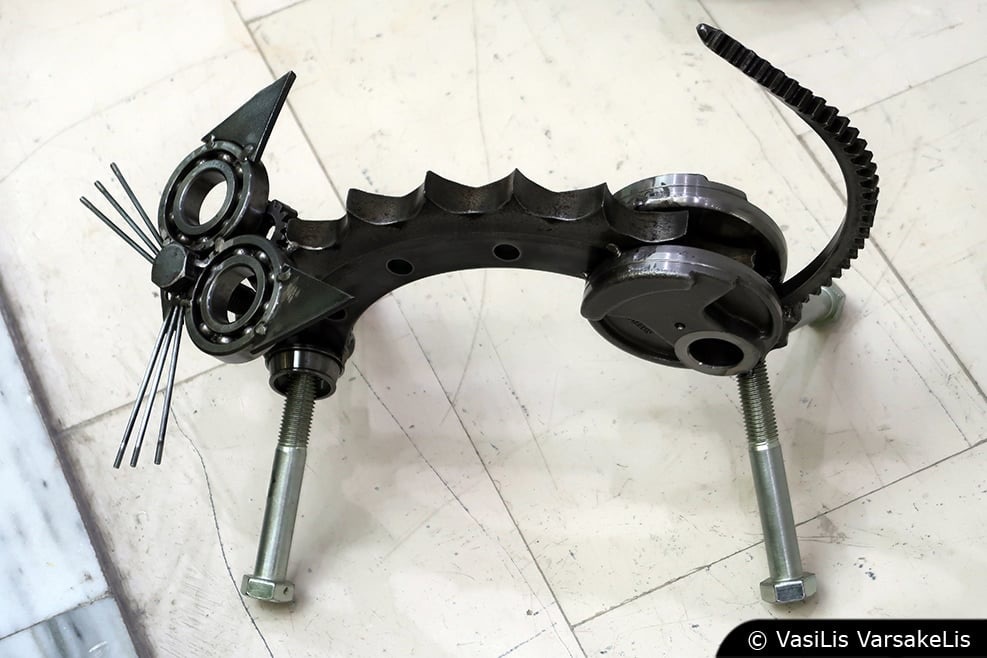 Μετά την απόφαση να δημιουργήσει μία σειρά από έργα που να έχουν τη μορφή γατιών, πέρασε αρκετούς μήνες αναζητώντας το κατάλληλο εξάρτημα και συνδέοντάς το με κάποιο άλλο. Μαζί με αυτά, συνδέει και την ιστορία που κουβαλά το καθένα τους, αφού όλα, ζουν μία δεύτερη …ζωή στα χέρια του. «Αυτό που κάνω είναι γλυπτική μετάλλου. Χρησιμοποιώ το γυμνό σίδηρο, με τα χρώματα που βγάζουν τα μέταλλα τα οποία είναι σμιλεμένα και δουλεμένα από τη χρήση και από το χρόνο», λέει ο καλλιτέχνης και εξηγεί: «Υπάρχουν χειρωνακτικά εργαλεία που μπορεί κάποιος εργάτης να χρησιμοποιούσε για πολλά χρόνια στην οικοδομή ή σε αγροτικές εργασίες προκειμένου να ζήσει την οικογένειά του και τα οποία από τη φθορά να έχουν πάρει ένα άλλο σχήμα από το αρχικό. Επίσης μπορεί να είναι εξαρτήματα από κάποιο όχημα, ένα αυτοκίνητο ή μια μοτοσυκλέτα που είχε κάποιος για πολλά χρόνια, αγαπούσε και είχε συνδεθεί μαζί του», αναφέρει, λέγοντας πως όλο αυτό είναι κάτι που τον γοητεύει, αφού η ιστορία που φέρουν, δεν μπορεί να περάσει απαρατήρητη.