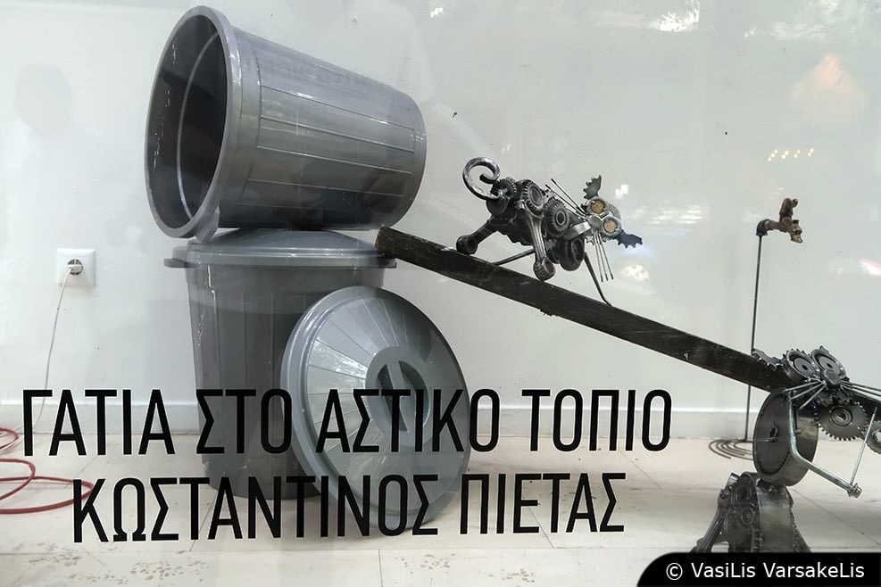 Φτιαγμένα από βίδες, γρανάζια, ρουλεμάν και παξιμάδια, τα οποία ο δημιουργός τους πήρε, συνδύασε και σμίλευσε σχηματίζοντας τη φιγούρα των συμπαθών τετράποδων αιλουροειδών, τα «Γατιά στο αστικό τοπίο», ποζάρουν σκανδαλιάρικα πίσω από τη βιτρίνα. Πρόκειται για έργα του εικαστικού Κωνσταντίνου Πιέτα από την Πρέβεζα, εξειδικευμένου στη γλυπτική μετάλλου, που δημιουργήθηκαν ειδικά για τις Βιτρίνες Τέχνης του ΟΤΕ στη Θεσσαλονίκη και φιλοξενούνται εκεί αυτήν την περίοδο.