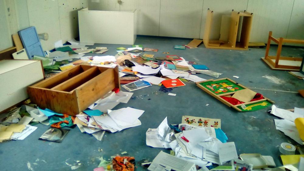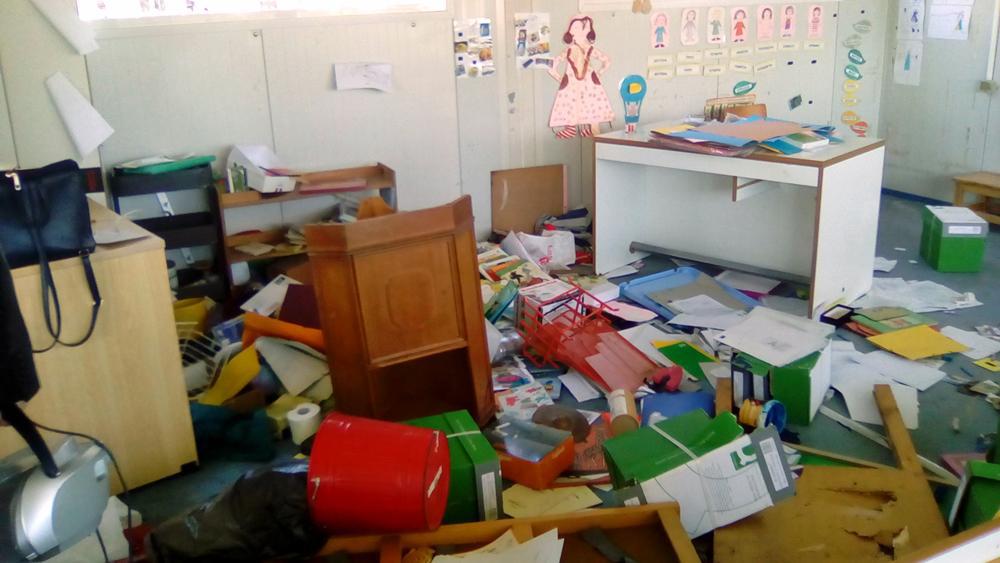 “Άγνωστοι μπήκαν μέσα, έριξαν κάτω τις βιβλιοθήκες, σκόρπισαν όλα τα χαρτιά, κατέστρεψαν τις αίθουσες, ενώ όλα τα καρεκλάκια-ζωάκια εξαφανίστηκαν, όπως και τα παγκάκια. Εφόσον δεν είχε πόρτα, όποιος ήθελε, όποτε ήθελε έμπαινε μέσα και έπαιρνε ό,τι ήθελε. Όταν άνοιξαν τα σχολεία μετά τις γιορτές, μαζεύτηκαν μάνες και οι συναδέλφισσες και συμμάζεψαν και καθάρισαν, χωρίς όμως αυτό να μπορεί να διατηρηθεί, γιατί το σχολείο είναι ένα ανοιχτό κουρέλι” περιέγραψε την κατάσταση η κ.Καβούνη. Πρόσθεσε μάλιστα ότι οι δασκάλες παραμένουν στη θέση τους καθημερινά, χωρίς πόσιμο νερό, χωρίς τουαλέτα (γιατί δεν υπάρχουν τα πιεστικά μηχανήματα που είναι ο μόνος τρόπος για να έχει νερό το σχολείο), “καθισμένες σε δυο μικρά καρεκλάκια, κρατώντας τις Θερμοπύλες”.