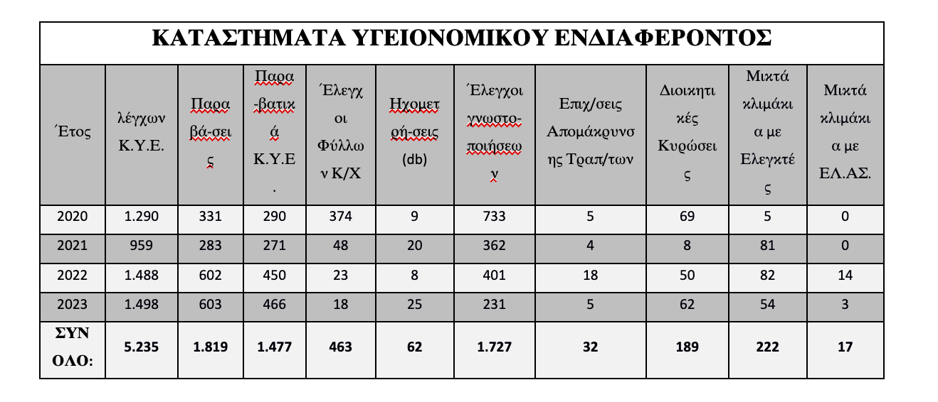 - Διενεργήθηκαν 5.235 έλεγχοι σε Καταστήματα Υγειονομικού Ενδιαφέροντος, εντοπίζοντας 1.477 παραβατικά καταστήματα που είχαν προβεί σε 1.819 παραβάσεις της κείμενης νομοθεσίας.