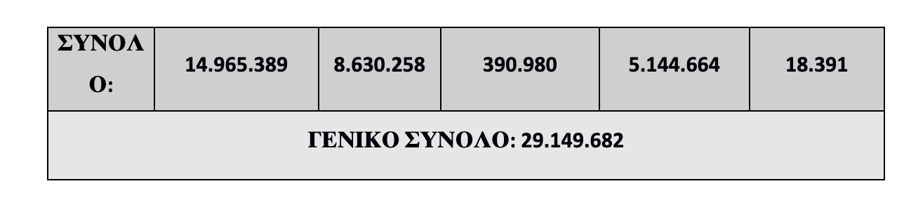 Σύνολο εσόδων: Είκοσι εννέα εκατομμύρια εκατόν σαράντα εννέα χιλιάδες εξακόσια ογδόντα δύο ευρώ (29.149.682€).