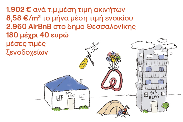 Από την προηγούμενη απογραφή, του 2011, προκύπτει πως ένα μεγάλο ποσοστό (28%) κενών σπιτιών στον Δήμο Θεσσαλονίκης που δηλώθηκαν ως μη χρησιμοποιούμενα. Πιθανότητα, όπως αναφέρουν επιστήμονες του κλάδου, στην πρόσφατη απογραφή το ποσοστό αυτό δεν ελαττώθηκε, αλλά μάλλον έχει αυξηθεί. Το 2022 σε έρευνα της Parallaxi αποτυπώνονταν 1.829 ακίνητα βραχυχρόνιας μίσθωσης, τύπου AirBnB στο δήμο Θεσσαλονίκης. Ο αριθμός αυτός τον Αύγουστο του 2023 ανέρχεται στα 2.960. Η ραγδαία αυτή αύξηση του 61% μέσα σε ενάμιση χρόνο, συνοδεύεται και από έναν συγκεντρωτισμό στην κατοχή των ακινήτων, καθώς μια εταιρεία φαίνεται πως διαθέτει πάνω από 300 διαμερίσματα για βραχυχρόνια μίσθωση σε όλη τη Θεσσαλονίκη, ενώ η επόμενη διαθέτει περίπου 150 ακίνητα. Επιπλέον, οι επισκέπτες του δήμου Θεσσαλονίκης έχουν στη διάθεση τους 65 καταλύματα. Οι τιμές στα ξενοδοχεία αυτά για ένα απλό μονόκλινο δωμάτιο κυμαίνονται από 180 μέχρι 40 ευρώ το βράδυ για ένα άτομο. Αν κανείς επιθυμεί να αναζητήσει μια σουίτα οι τιμές φτάνουν μέχρι και τα 3.110€. Από αυτά, 7 συγκαταλέγονται στα πεντάστερα, ενώ 40 διαθέτουν τουλάχιστον 3 αστέρια.