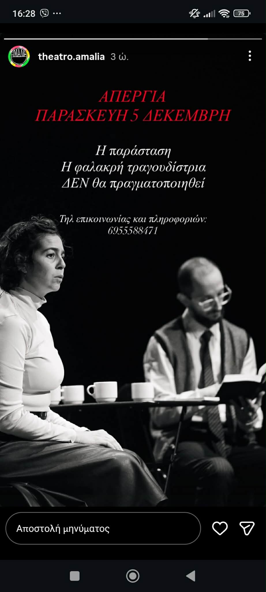 Πιο συγκεκριμένα η παράσταση που αναβλήθηκε σήμερα σύμφωνα και με την σχετική ανακοίνωση του θεάτρου είναι «Η Φαλακρή Τραγουδίστρια» του Ευγένιου Ιονέσκο και θα παιζόταν στο θέατρο Αμαλία στις 21:00.