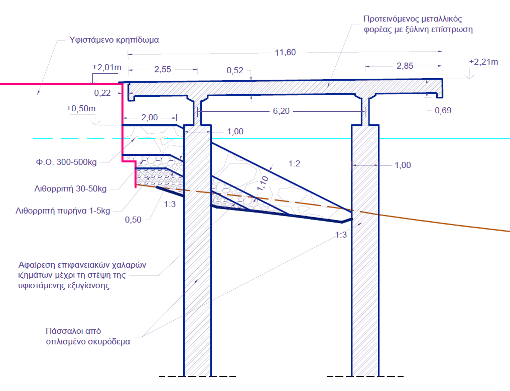 - Ξύλινο κατάστρωμα (deck), πλάτους 12,0 m και μήκους 1.100 m, το οποίο εδράζεται σε πασσάλους από σκυρόδεμα. Το ντεκ θα είναι στατικά ανεξάρτητο από το υφιστάμενο κρηπίδωμα.