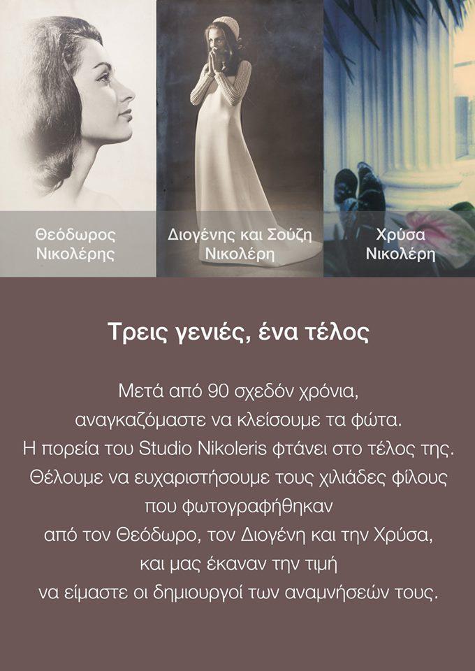 Οι ιδιοκτήτες έγραψαν σε ένα άκρως συγκινητικό μήνυμά τους ότι «αναγκαζόμαστε να κλείσουμε τα φώτα. Η πορεία του Studio Nikoleris φτάνει στο τέλος της. Θέλουμε να ευχαριστήσουμε τους χιλιάδες φίλους που φωτογραφήθηκαν από τον Θεόδωρο, τον Διογένη και τη Χρύσα και μας έκαναν την τιμή να είμαστε οι δημιουργοί των αναμνήσεών τους».