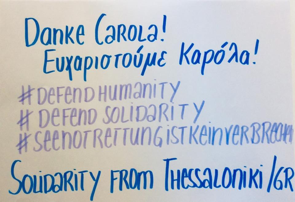 Μια καμπάνια αλληλεγγύης υπέρ της Καρόλα Ρακέτε βρίσκεται σε εξέλιξη στη Θεσσαλονίκη, μετά από τη σύλληψη της καπετάνισσας του γερμανικού σκάφους διάσωσης Sea-Watch 3 από τις ιταλικές Αρχές.
