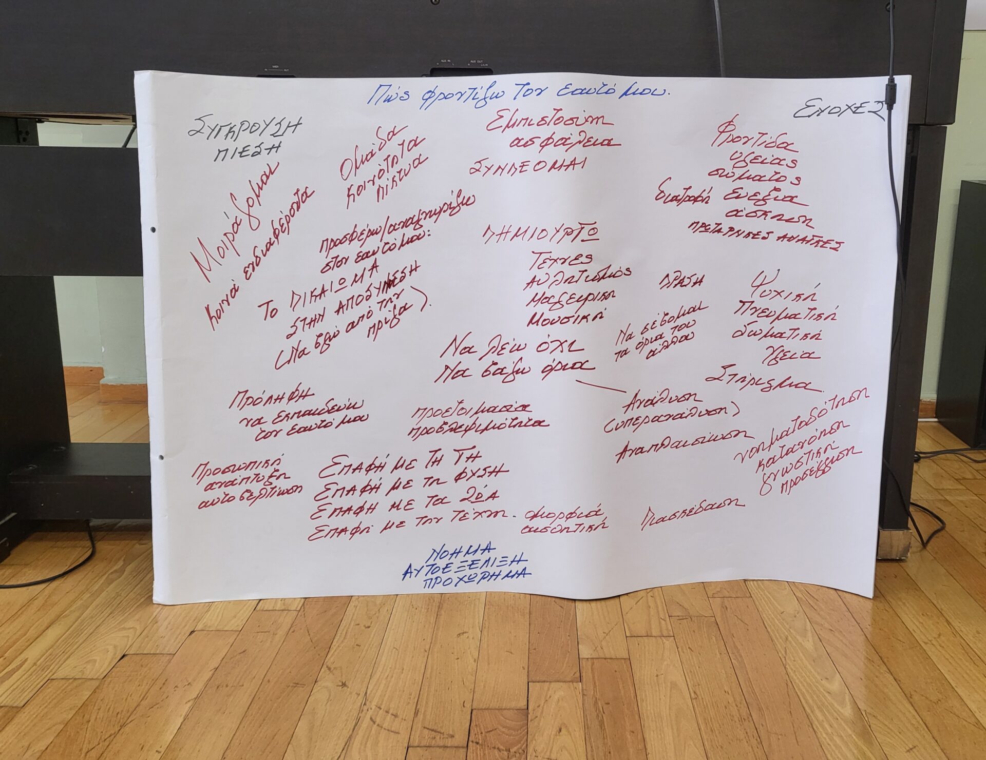 Η συγκεκριμένη ομάδα έδωσε μάλιστα τον ρυθμό στην από κοινού δημιουργία μιας στρατηγικής αυτο-φροντίδας, μιλώντας για έκφραση και επικοινωνία μέσω του χορού, της τέχνης, της μουσικής, της δημιουργικότητας. Όλοι οι συμμετέχοντες έφεραν πολύτιμη πληροφορία, δημιουργώντας συλλογικά μια «συνταγή» για τη φροντίδα του εαυτού, μιλώντας για μοίρασμα, για επαφή με τη φύση, για διαλείμματα από την ευθύνη, για σύνδεση και δικτύωση, για αναζήτηση νοήματος.