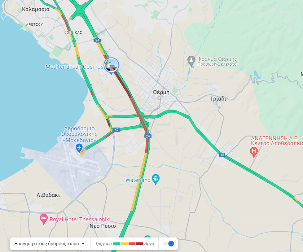 Με αργούς ρυθμούς και μποτιλιάρισμα κινούνται τα οχήματα στην έξοδο προς Χαλκιδική και ειδικότερα στην Ε.Ο Θεσσαλονίκης – Μουδανιών, από το ύψος του εμπορικού κέντρου Mediterranean Cosmos μέχρι και την Waterland.