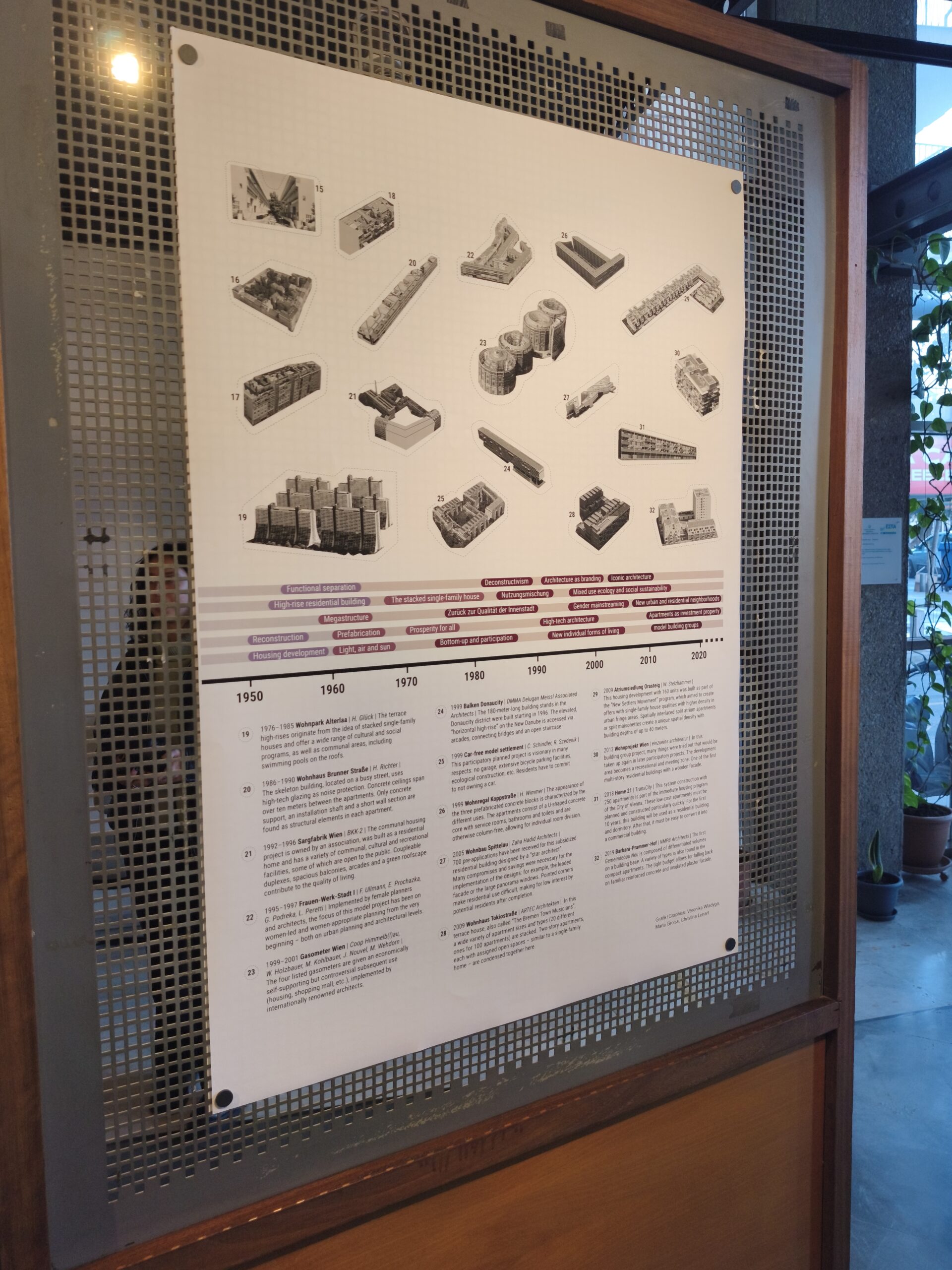 Σε έναν άλλο πίνακα, υπήρχε ένα χρονολόγιο με τις εξελίξεις στις αρχιτεκτονικές τυπολογίες και στις τυπολογίες αστικών αποσπασμάτων όσον αφορά την κατοικία, από τα τέλη του 19ου αιώνα (περίοδος Gründerzeit) στη φάση του Μοντερνισμού και έπειτα στα νεότερα χρόνια.