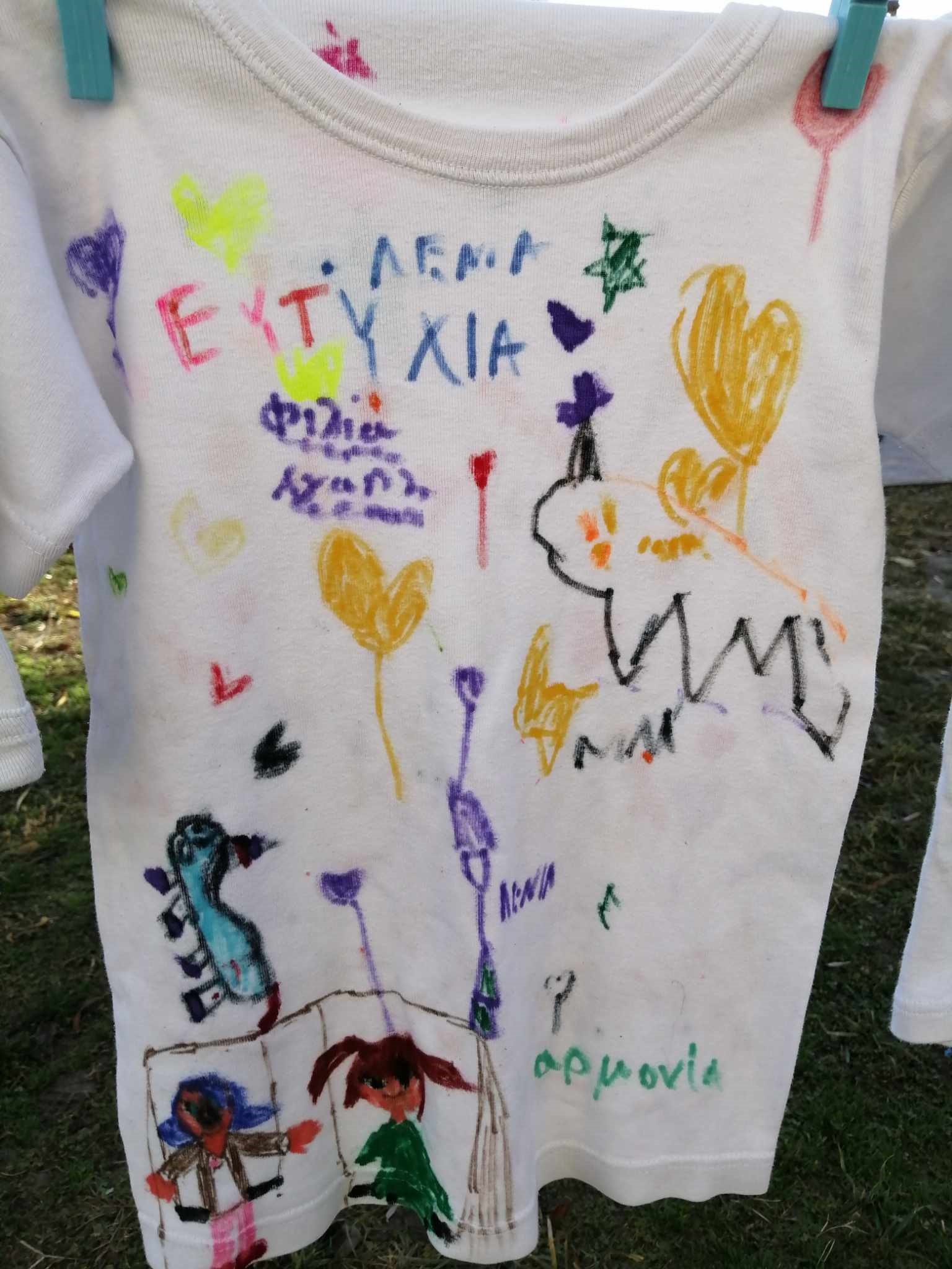 Το ένα φανελάκι απλωμένο δίπλα στο άλλο με επιμέλεια και τάξη θυμίζει μπουγάδα στην αυλή του χωριού. Η μπουγάδα αυτή όμως είναι διαφορετική και στα μανταλάκια δεν είναι κρεμασμένα τα φρεσκοπλυμένα ρούχα αλλά η «ευτυχία», όπως την αποτύπωσαν ζωγραφίζοντας τις φανέλες τους οι μικροί μαθητές.