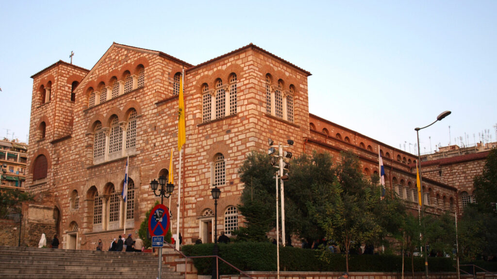 Ο ναός κτίστηκε στα ερείπια ρωμαϊκού συγκροτήματος λουτρού, στη θέση ενός αρχικά μικρού ευκτήριου οίκου. Ακολούθησε η ανέγερση μεγαλοπρεπούς βασιλικής η οποία καταστράφηκε ολοσχερώς από την πυρκαγιά του 1917, ενώ ανεγέρθηκε αργότερα 1918- 1948. Ο ναός, αφιερωμένος στον πολιούχο Άγιο της Θεσσαλονίκης, φέρει ψηφιδωτό διασωθέν από την πυρκαγιά. Κάτω από το εγκάρσιο κλίτος του ναού βρίσκεται η κρύπτη. Αρχαιολογικές ανασκαφές ανέδειξαν στο ανατολικό τμήμα του Ναού Ρωμαϊκό νυμφαίο με κρήνες. Στη νοτιοανατολική πλευρά του περιβόλου του Ναού υπήρχε ως το 1917 κρήνη, περίτεχνης κατασκευής, που εξυπηρετούσε τους πεζούς των οδών Αγ. Δημητρίου και Αγ. Νικολάου.