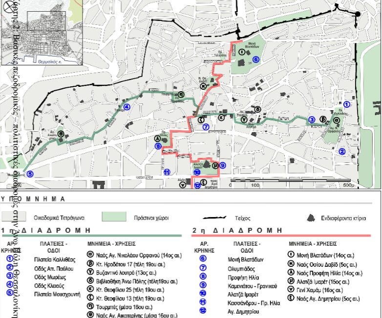 Με τη νέα πρόταση των βασικών πεζοδρομικών-πολιτιστικών διαδρομών συνδέονται οι πλατείες, ενώ προβάλλονται με επάρκεια ιστορικά τοπόσημα και κρήνες, σταθερά χωρικά σημεία που βοηθούν να επανασημειολογήσουμε την περιοχή και να διερευνήσουμε με νέους «νοητικούς» χάρτες και άλλα μέσα για την πολιτιστική ιστορία της (genius loci). Το χθες και το σήμερα προοιωνίζουν τη συνέχεια, αλλά και τη μελλοντική αξία της περιοχής.