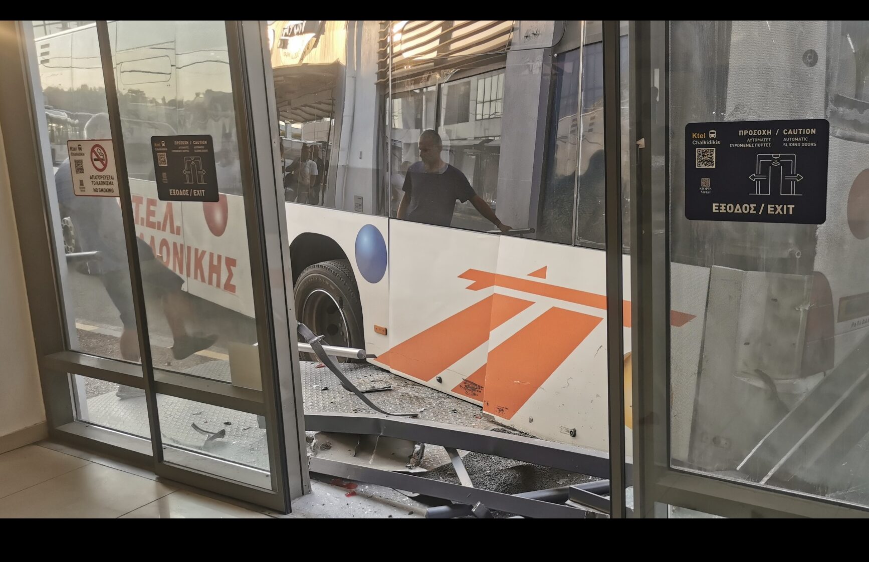 Σκηνές πανικού προκλήθηκαν στον σταθμό των ΚΤΕΛ Χαλκιδικής, όταν ένα λεωφορείο έπεσε πάνω σε κτιριακές εγκαταστάσεις.