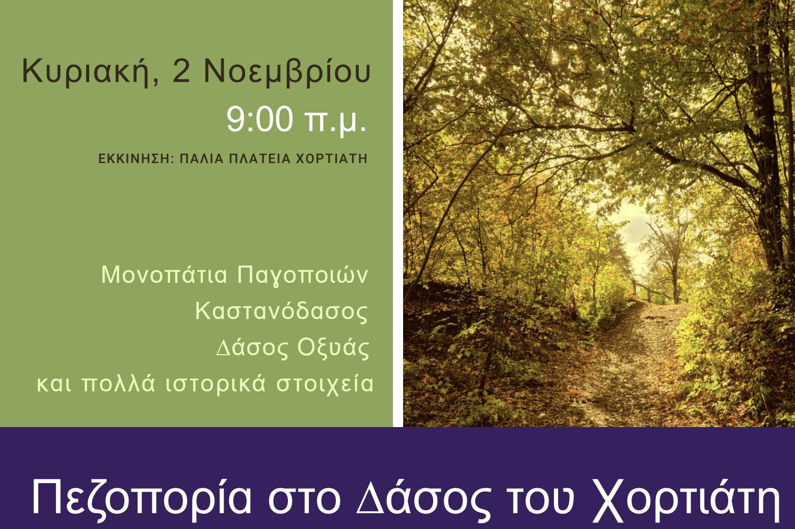 Εδώ και 30 χρόνια, η “Κίνηση Πολιτών Χορτιάτη”, ο Αθλητικός Σύλλογος Χορτιάτη, και η εφημερίδα “ΧΟΡΤΙΑΤΗΣ 570” διοργανώνουμε την πρώτη Κυριακή του Νοέμβρη την καθιερωμένη πλέον πεζοπορία για να γνωρίσουμε και να χαρούμε το πολυποικιλιακό, πανέμορφο, και ζωογόνο δάσος του Χορτιάτη, μόλις 20 χιλιόμετρα από το Λευκό Πύργο.