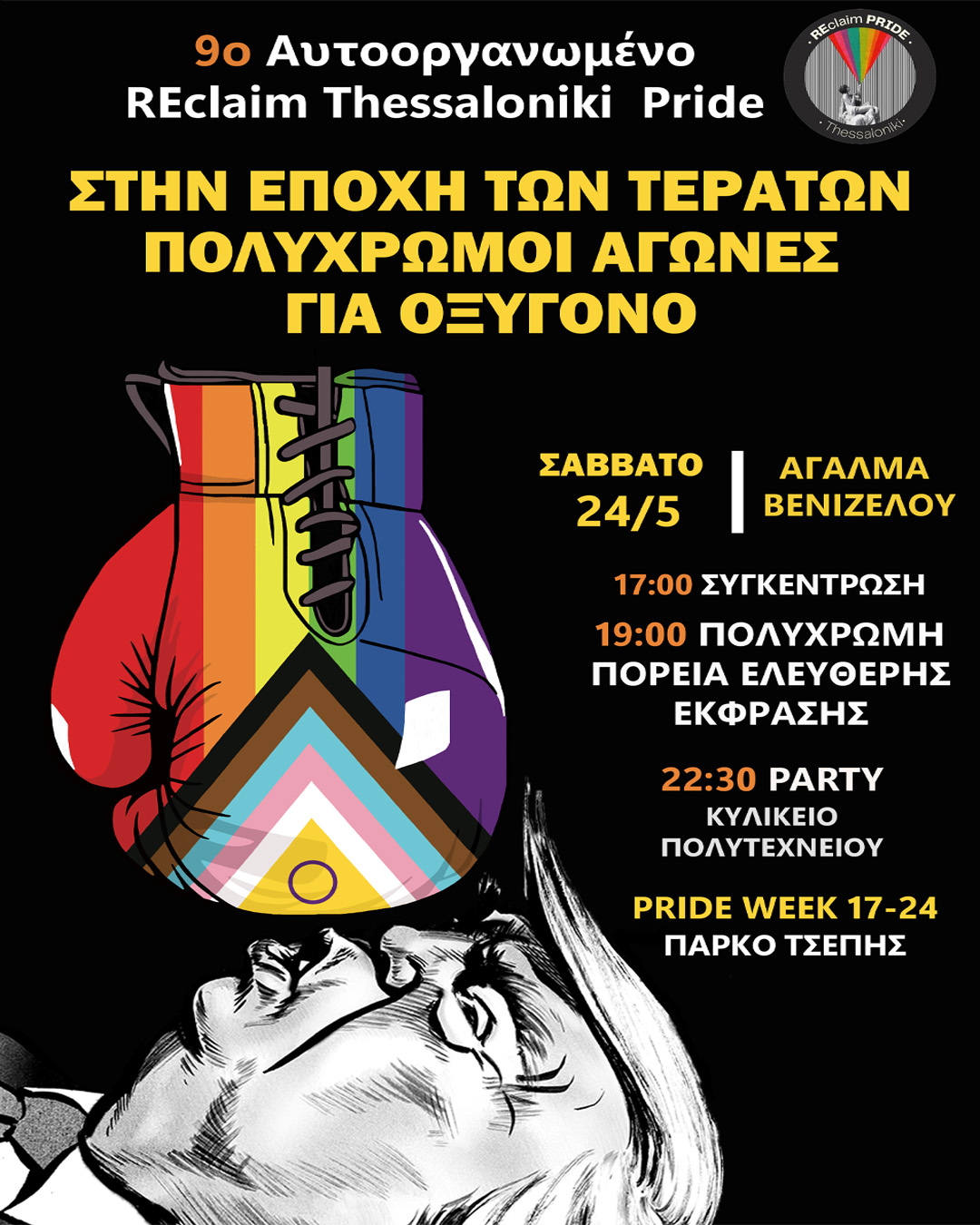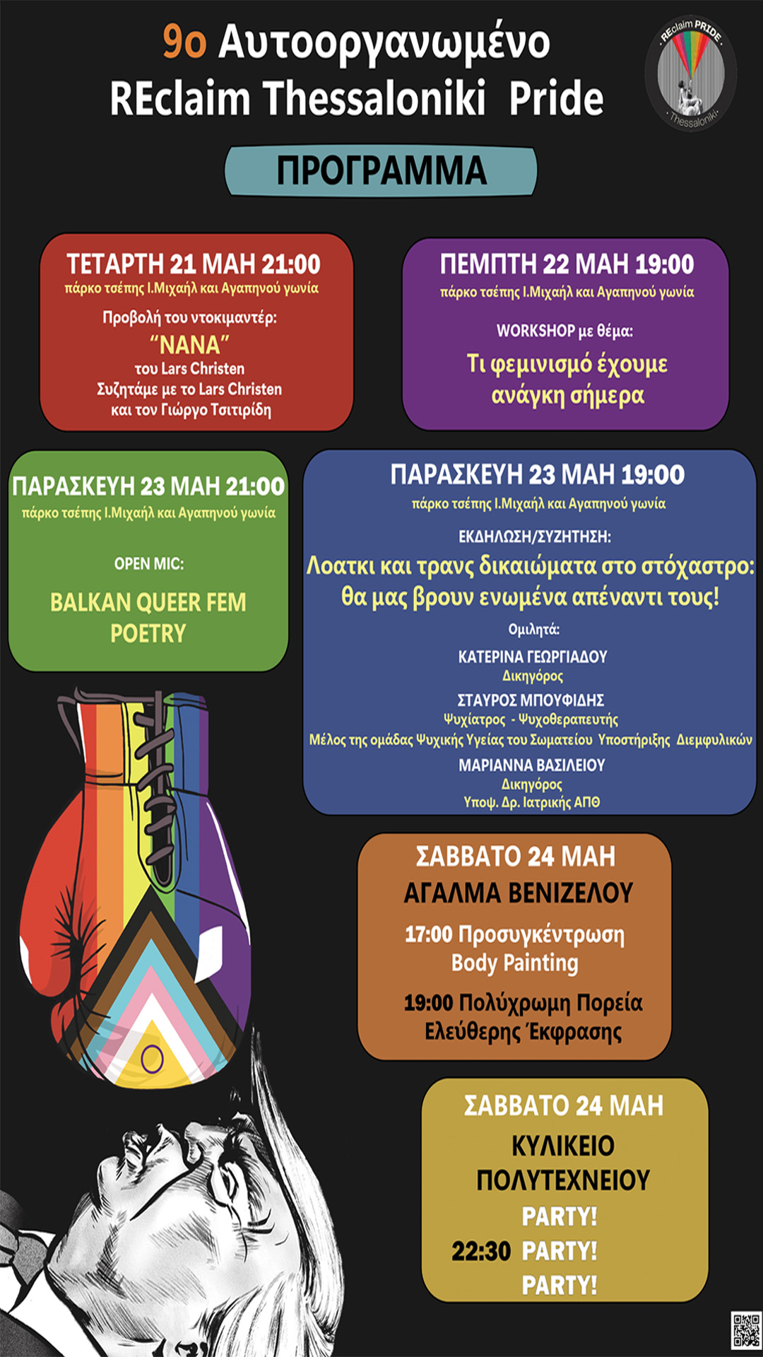 Η Pride week στη Θεσσαλονίκη έχει ήδη ξεκινήσει από τις 17 Μάη και θα διαρκέσει έως τις 24 Μάη. Θα κορυφωθεί το Σάββατο 24 Μάη με συγκέντρωση στις 17.00 στο άγαλμα Βενιζέλου και Πολύχρωμη Πορεία Ελεύθερης Έκφρασης στις 19.00, ενώ θα ακολουθήσει λοατκια+ πάρτι (22.30).