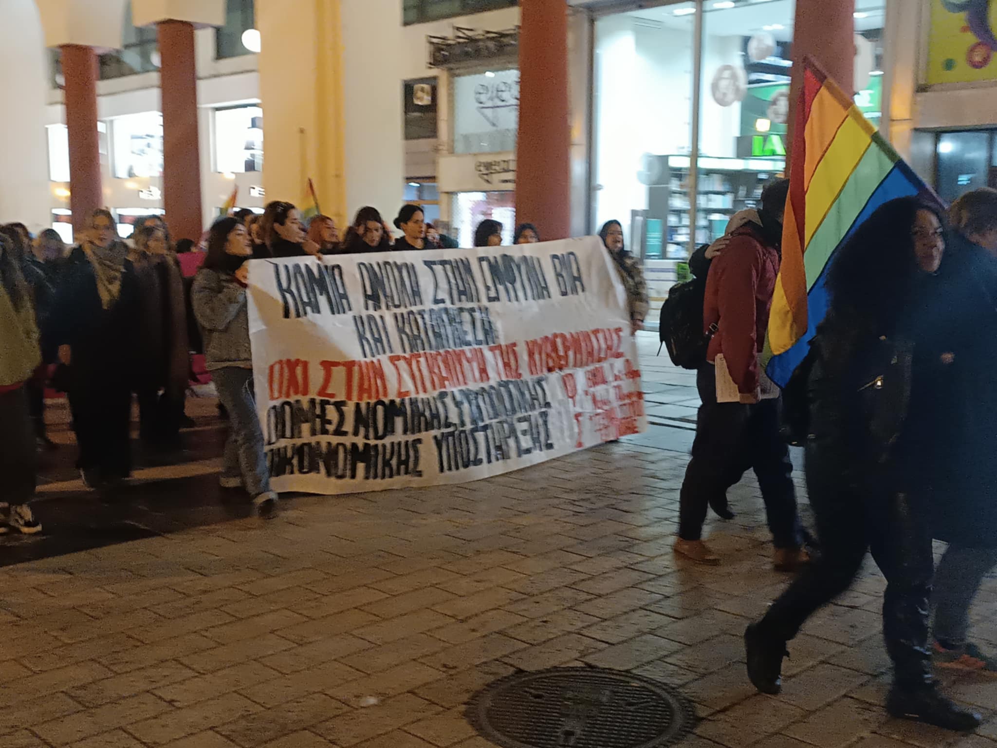 Με πανό και συνθήματα διαμαρτύρονται κατά της έμφυλης βίας και την κακοποίηση των γυναικών αλλά και υπέρ της ελεύθερης επιλογής τους στην άμβλωση. Η πορεία αυτή ξεκίνησε από το άγαλμα Βενιζέλου και κινείται και αυτή στο κέντρο της πόλης.