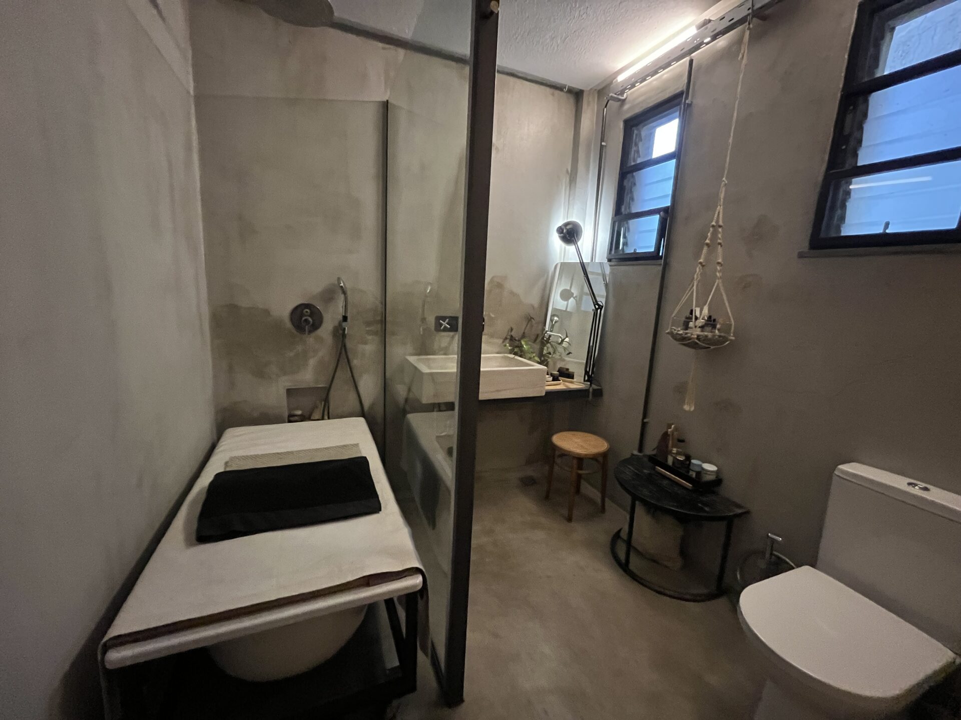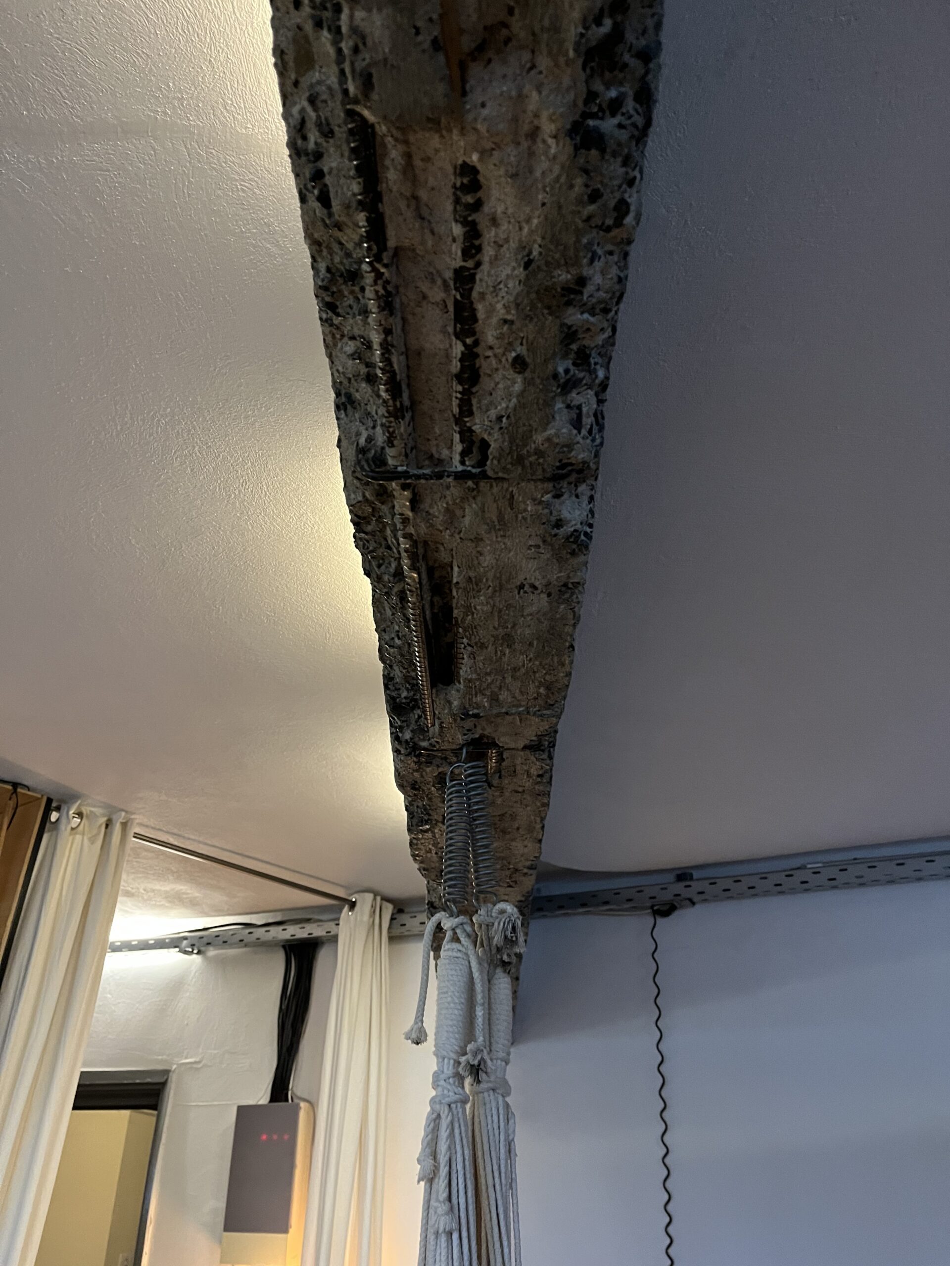 Αυτό επιβεβαιώνει και το φθαρμένο μπετόν στην οροφή, όπου μπορείς να δεις τα σκουριασμένα μέταλλα στο εσωτερικό του. Από το μπετόν κρέμεται μία αιώρα, για προσωπικές στιγμές χαλάρωσης και γαλήνης.