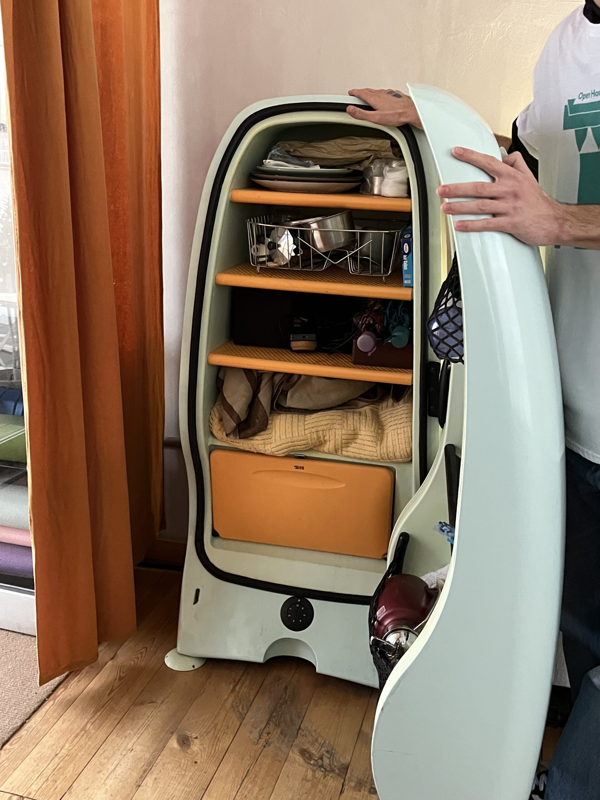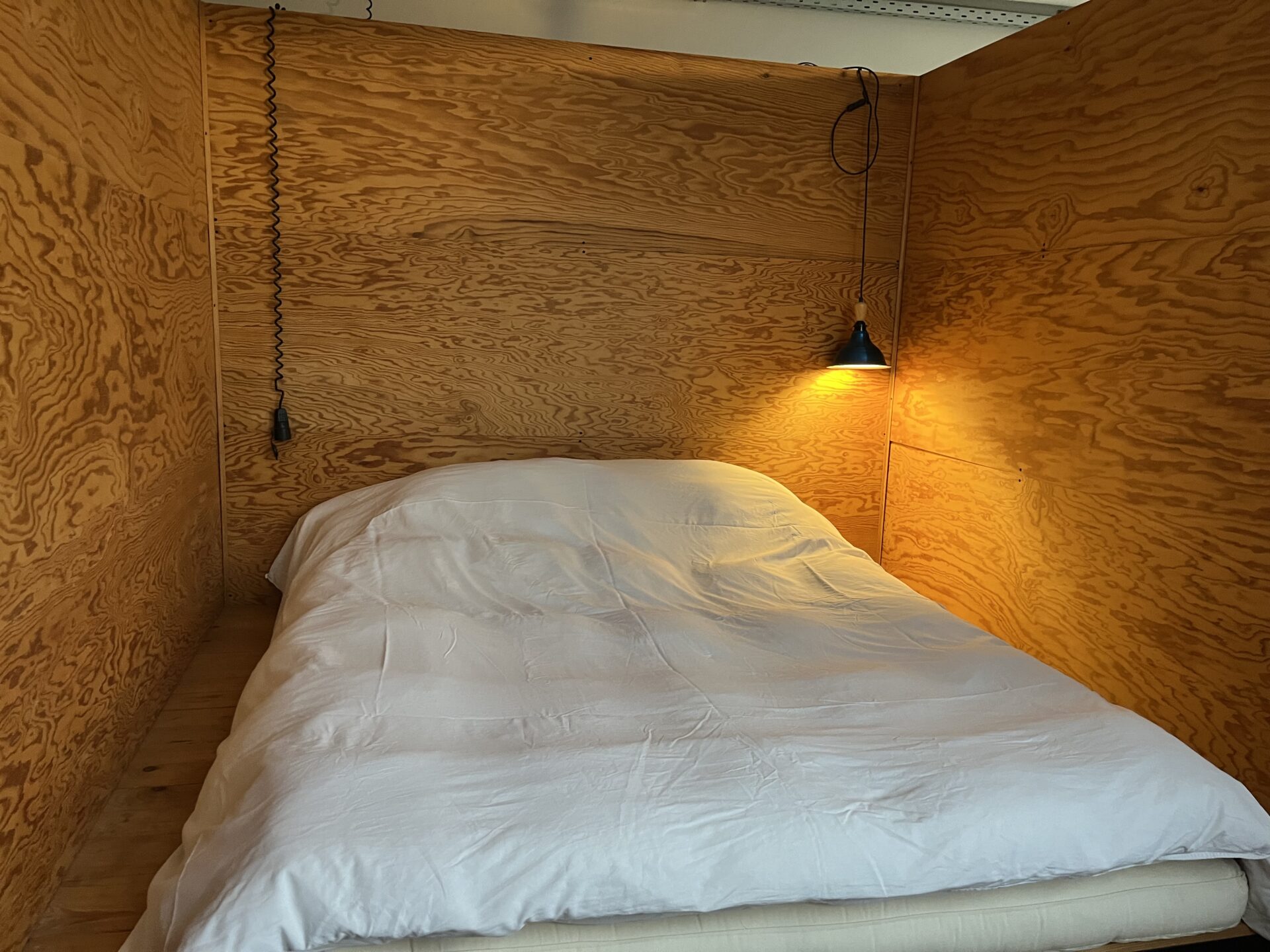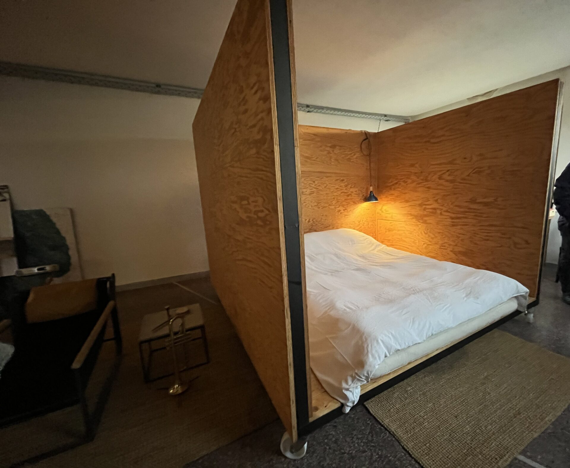 Αυτό που σίγουρα κεντρίζει το μάτι είναι το υπνοδωμάτιο – ή καλύτερα το στρώμα για τον ύπνο, το οποίο βρίσκεται μέσα σε έναν ξύλινο κύβο, που κινείται ελεύθερα μέσα στον χορό, με ροδάκια.