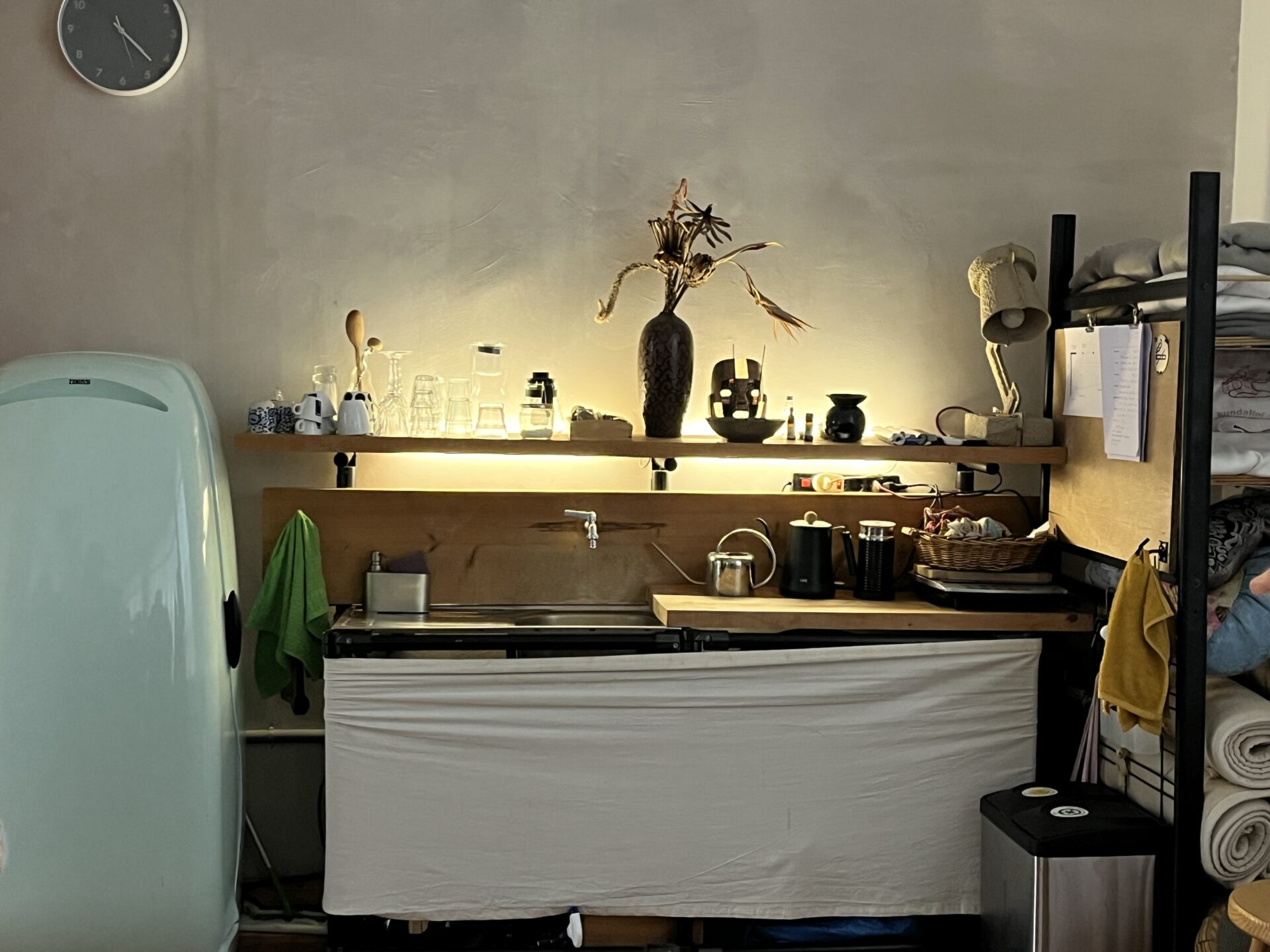 Η ανακαίνιση του κ. Τσολάκη ξεκίνησε από την κουζίνα, με έναν επαγγελματικό inox πάγκο. Ως λάτρης της εργονομίας, δεν τοποθέτησε ντουλάπια κουζίνας καθώς πιστεύει ότι «σε έναν περιορισμένο χώρο επιτυγχάνεται καλύτερα η ευτυχία του ανθρώπου».
