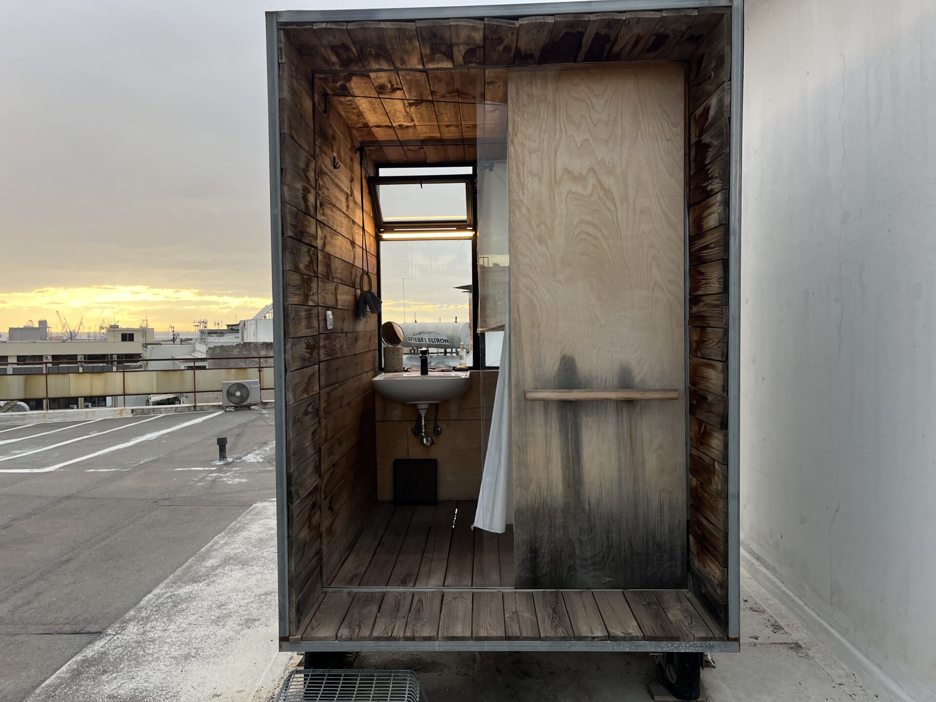 Στην ταράτσα βρίσκεται και ένα WC, μία προσωρινή κατασκευή από μέταλλο, ξύλο και γυαλί πάνω σε ροδάκια – πλήρως λειτουργικό και συνάμα εντυπωσιακό.