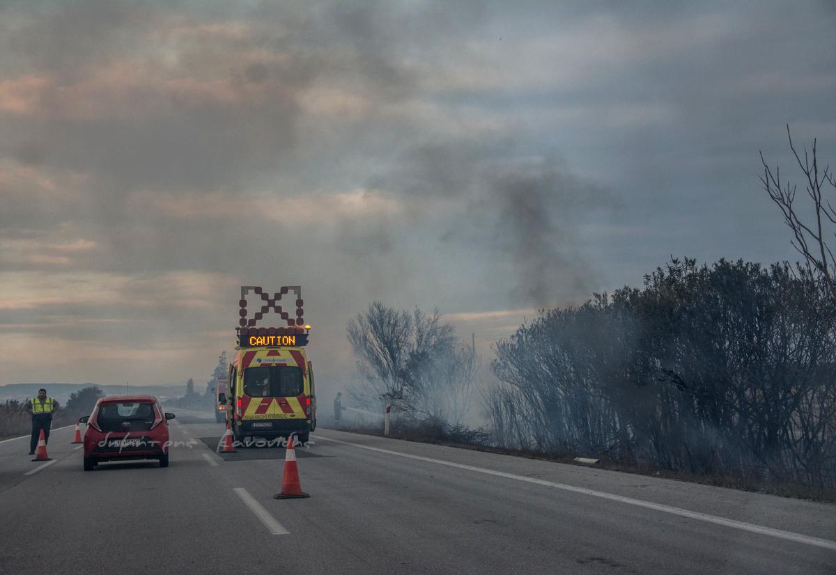 Λίγο πριν τις 6 το απόγευμα από καύση καλαμιών, μερικά μέτρα μετά τα διόδια των Μαλγάρων, και με κατεύθυνση προς Θεσσαλονίκη, εκδηλώθηκε πυρκαγιά, και στα δύο μέρη του δρόμου.